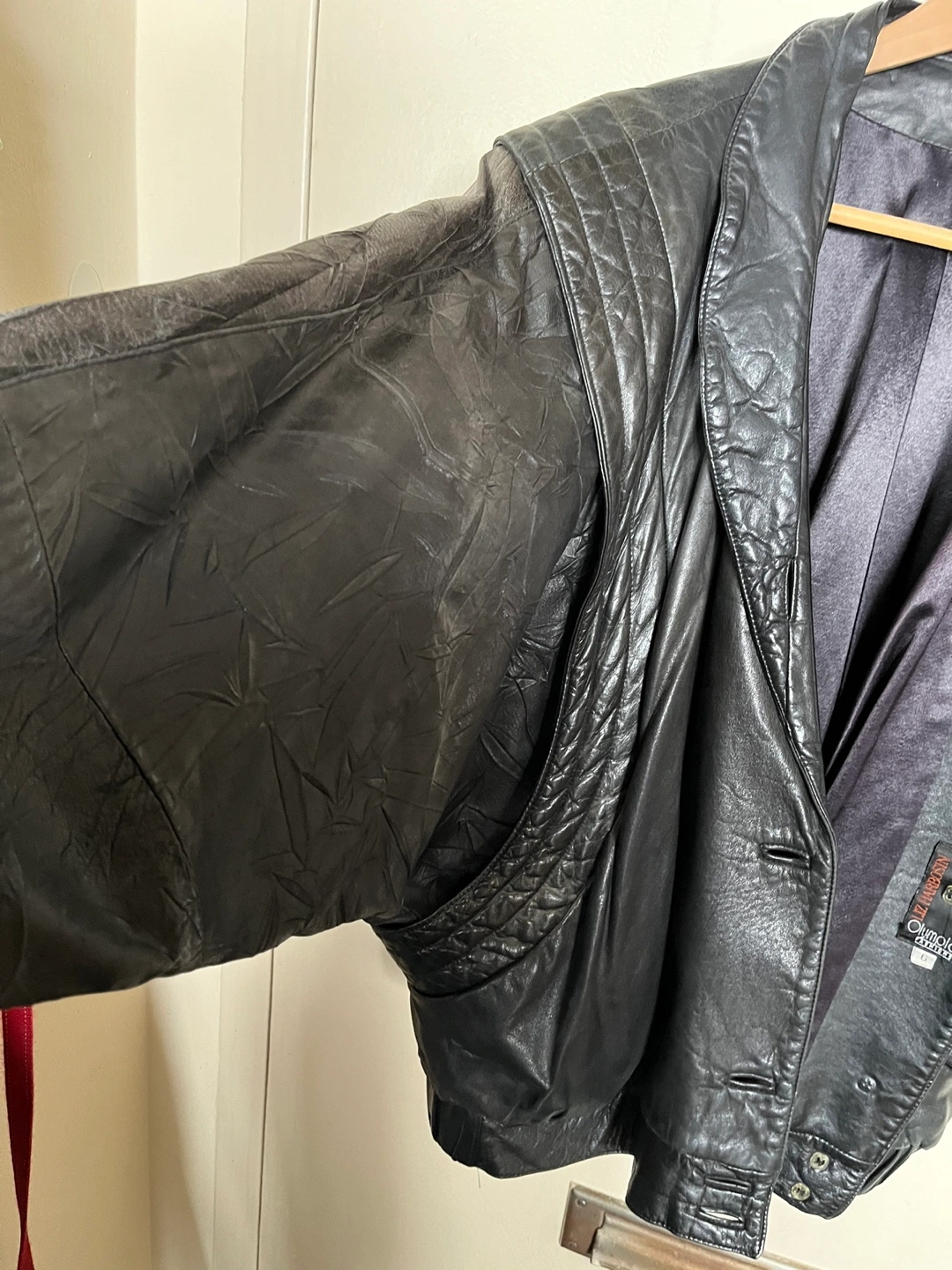 Black leather jacket with a few buttons and some shoulder padding. A great jacket for your wardrobe. It is perfect for any occasion. Loose fitting -vintage