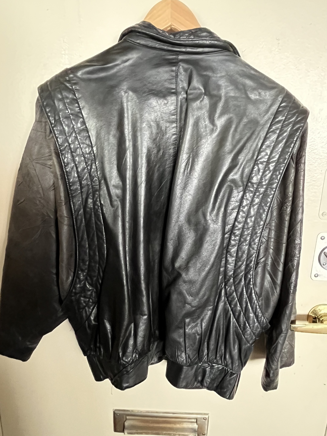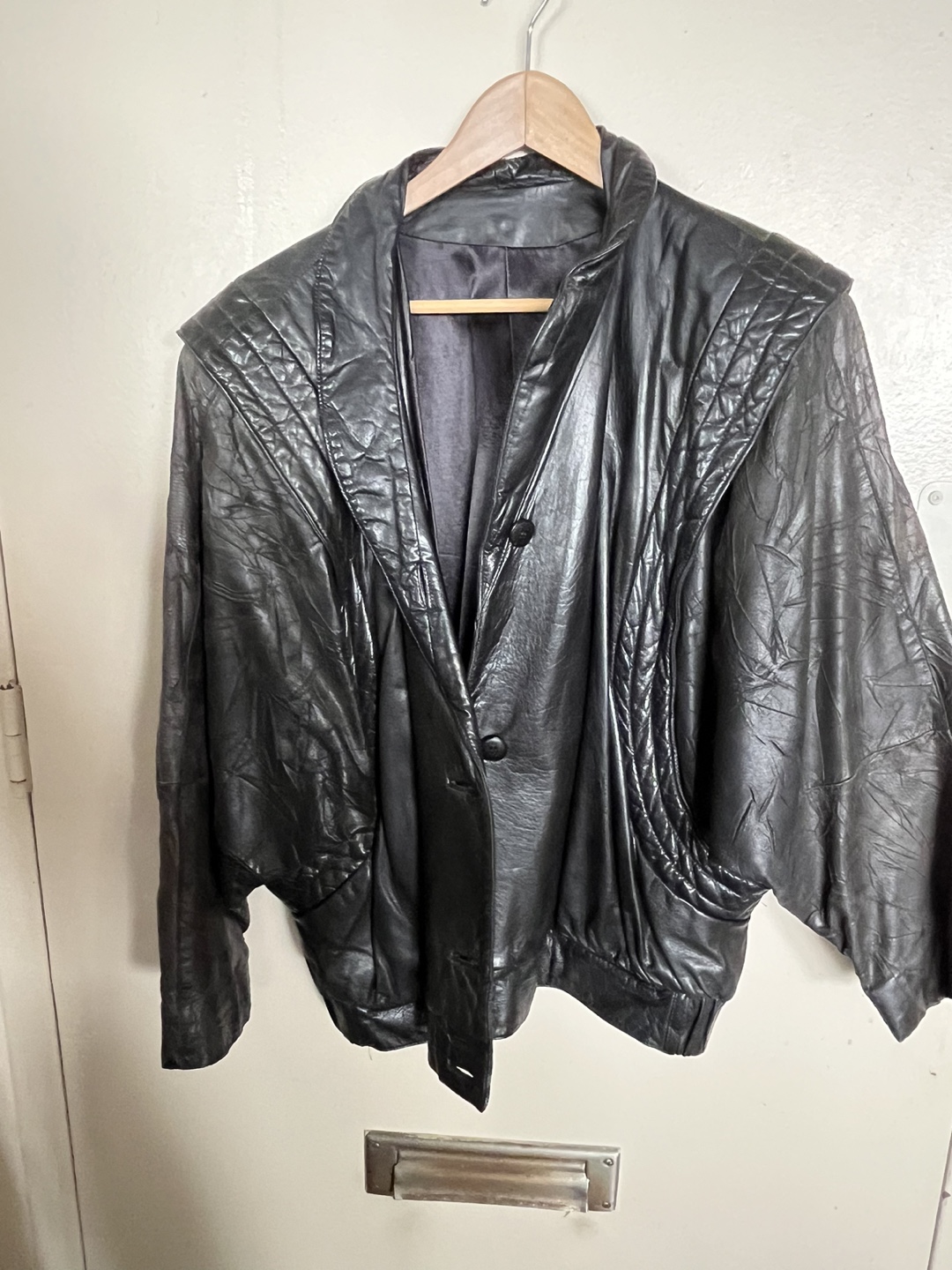 Black leather jacket with a few buttons and some shoulder padding. A great jacket for your wardrobe. It is perfect for any occasion. Loose fitting -vintage