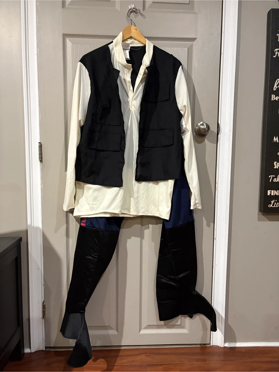 Selling a Han Solo costume from Star Wars! It includes a shirt with an attached vest, a pair of pants with boot tops, a belt, and a gun belt with a leg strap. Great for Halloween or cosplay!