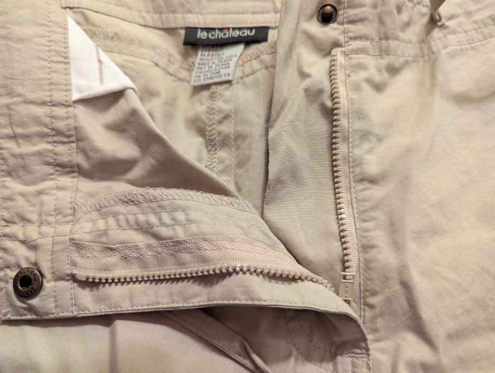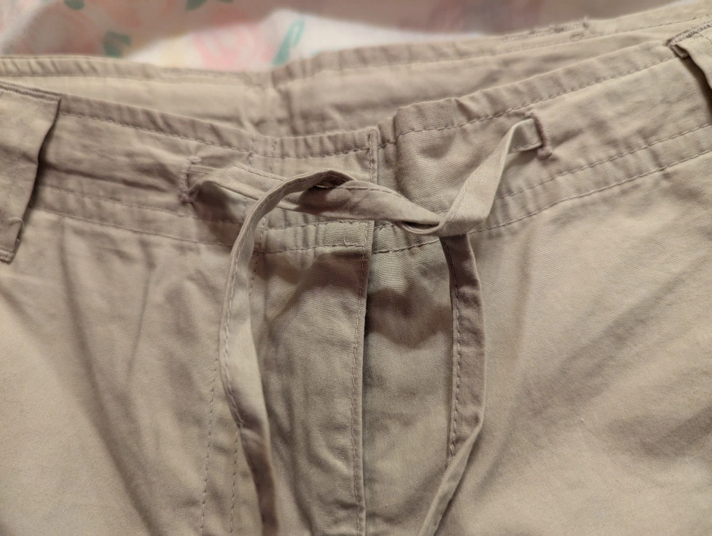 Selling a pair of Le Chateau pants in a neutral beige colour. They are made of 100% cotton and are sized 7/8. The lenght is 32 inches. These pants are low cut and relaxed fit and would be great for casual wear!