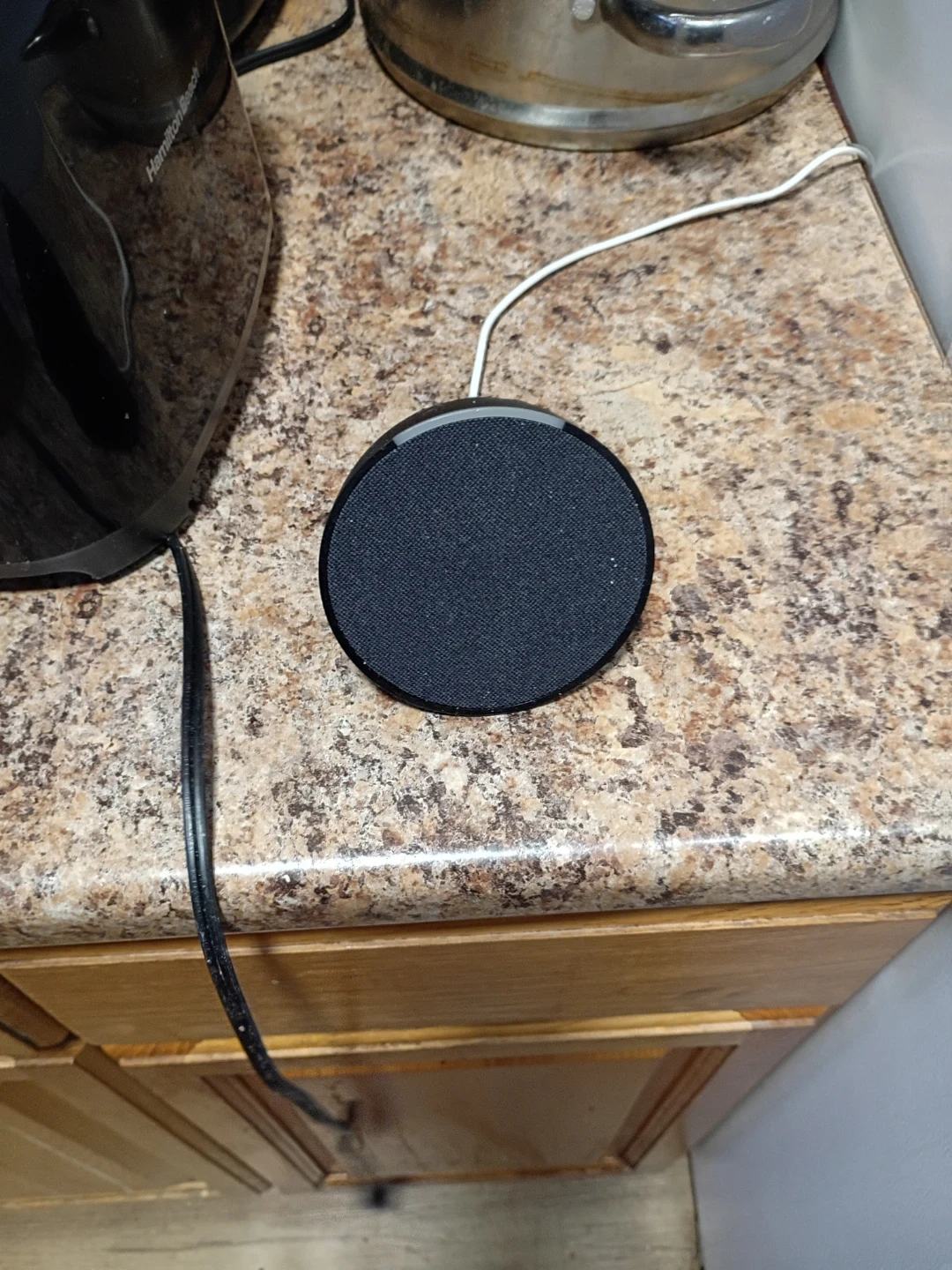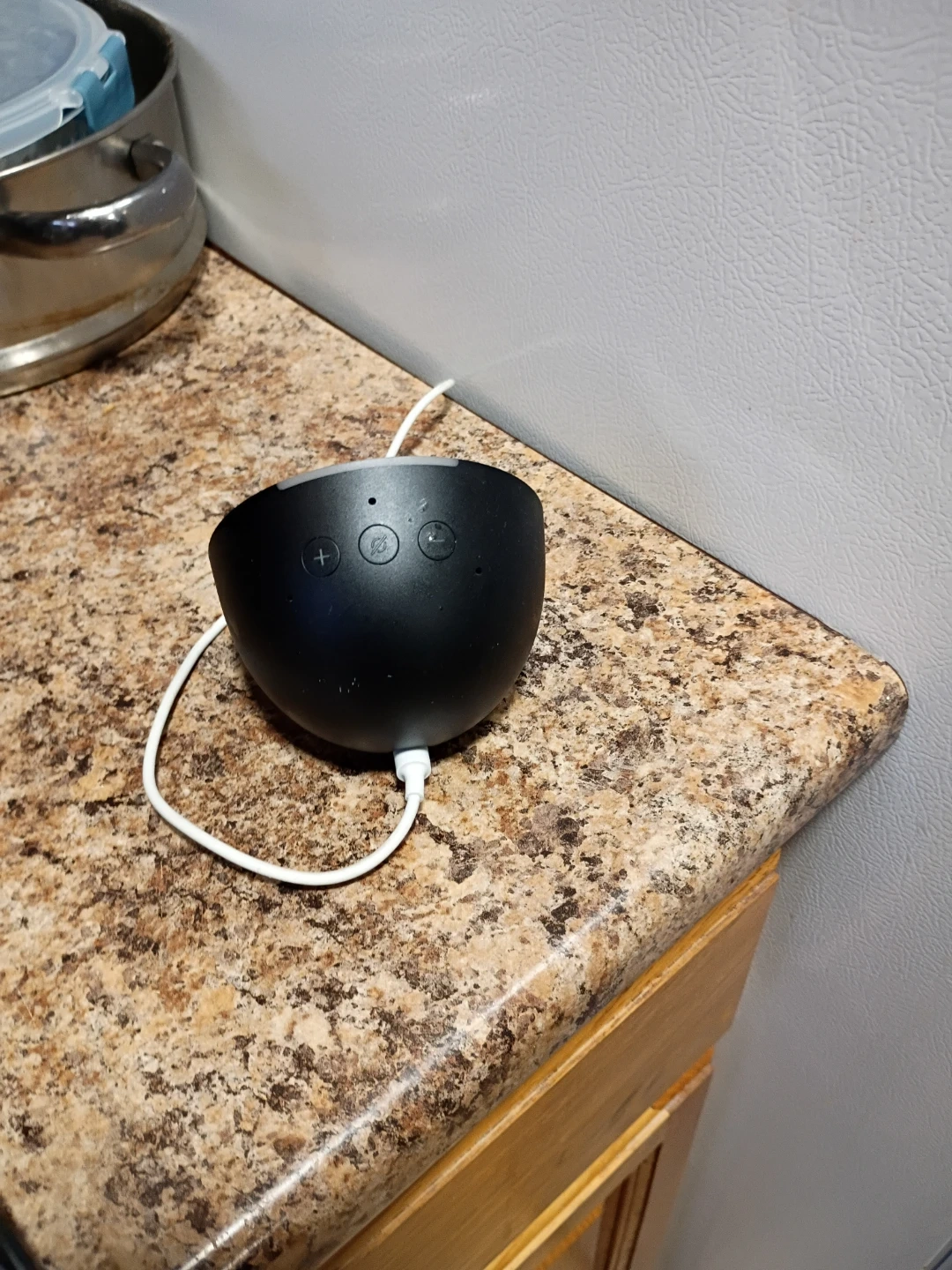 This is an Amazon Echo Dot, 3rd Generation, in black. It's a smart speaker that connects to Wi-Fi. It has volume controls and an action button on top. It comes with a charging cable.