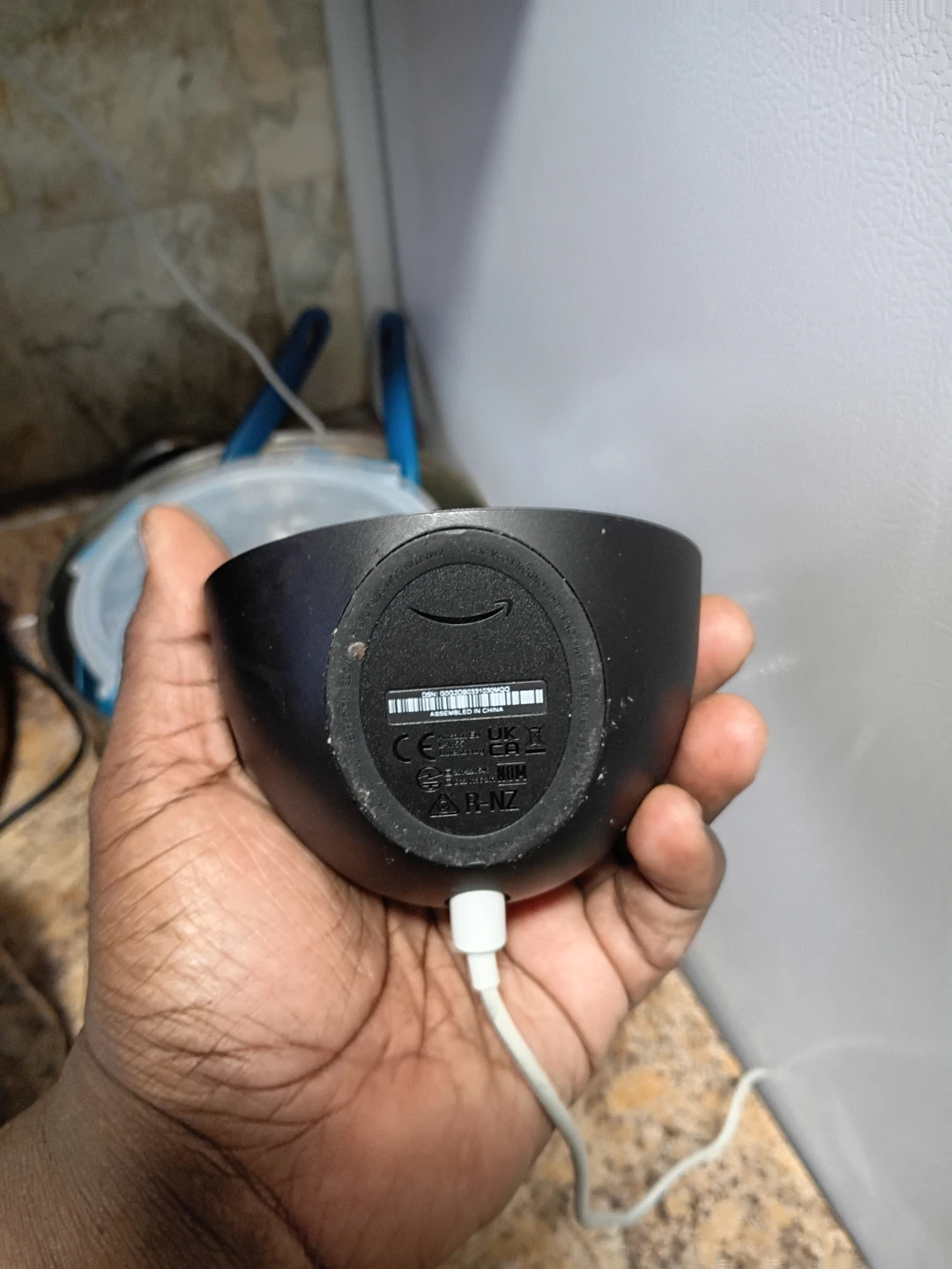 This is an Amazon Echo Dot, 3rd Generation, in black. It's a smart speaker that connects to Wi-Fi. It has volume controls and an action button on top. It comes with a charging cable.