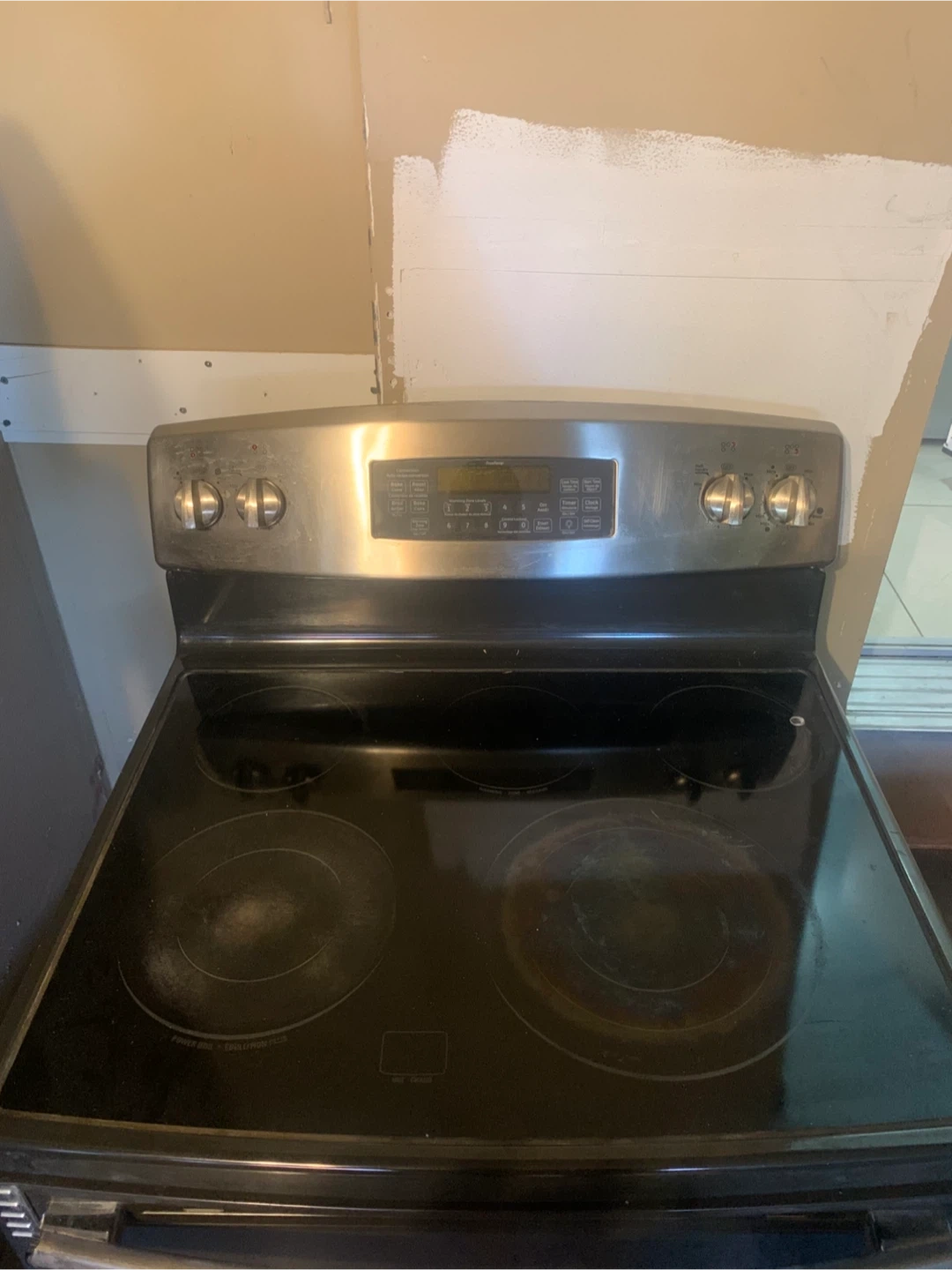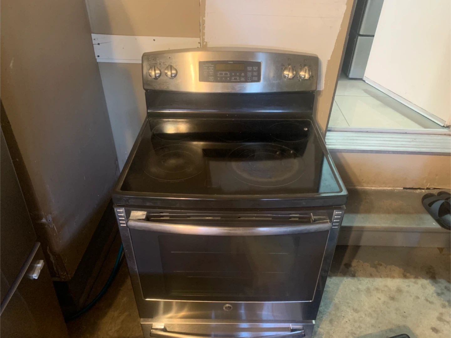 127Stainless steel GE electric stove with a smooth glass-ceramic cooktop and built-in oven. Features 4 heating elements, a digital display, and a spacious oven ideal for baking and roasting. The appliance has a lower drawer for extra storage and a sleek, modern design that fits most kitchen spaces. Condition: Used but in good working condition. Minor cosmetic wear consistent with regular use. Approximate Dimensions: Width: 76 cm Depth: 66 cm Height: 120 cm Additional Info: Easy-to-clean glass top surface Reliable and efficient heating Great for home kitchens or rentals