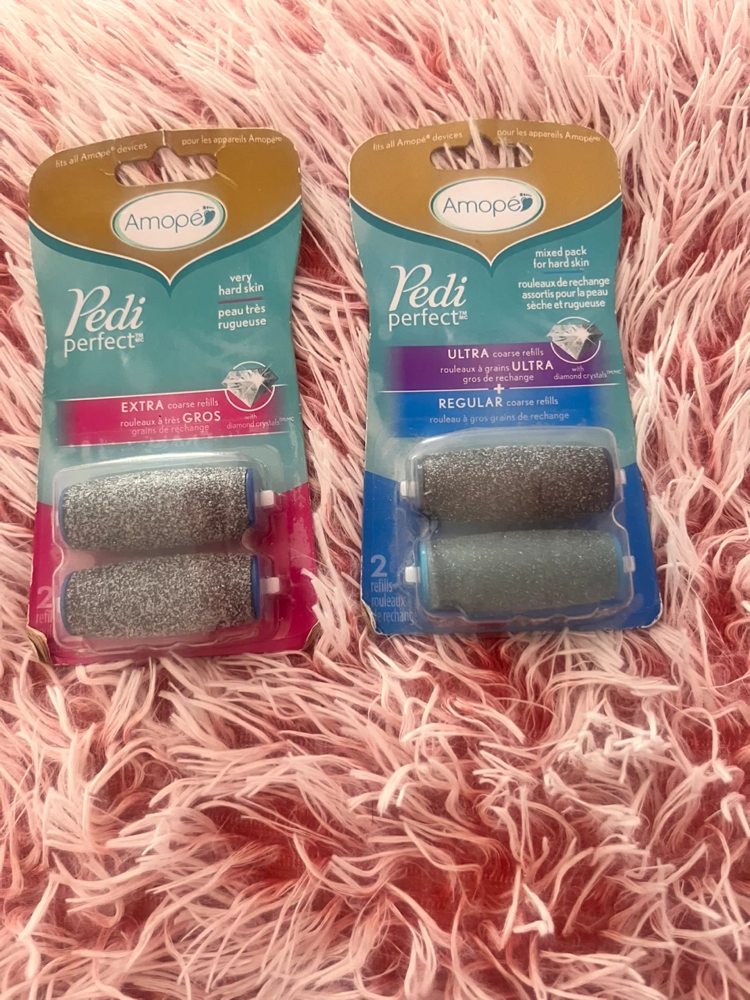 Includes one pack of EXTRA coarse refills for very hard skin and one mixed pack with ULTRA coarse and REGULAR coarse refills. These rollers are designed to fit all Amopé devices and feature diamond crystals. They're great for removing hard, rough skin. Unopened packs. They are over 20$ per pack at Shoppers. I’m asking 20$ for both packs together.