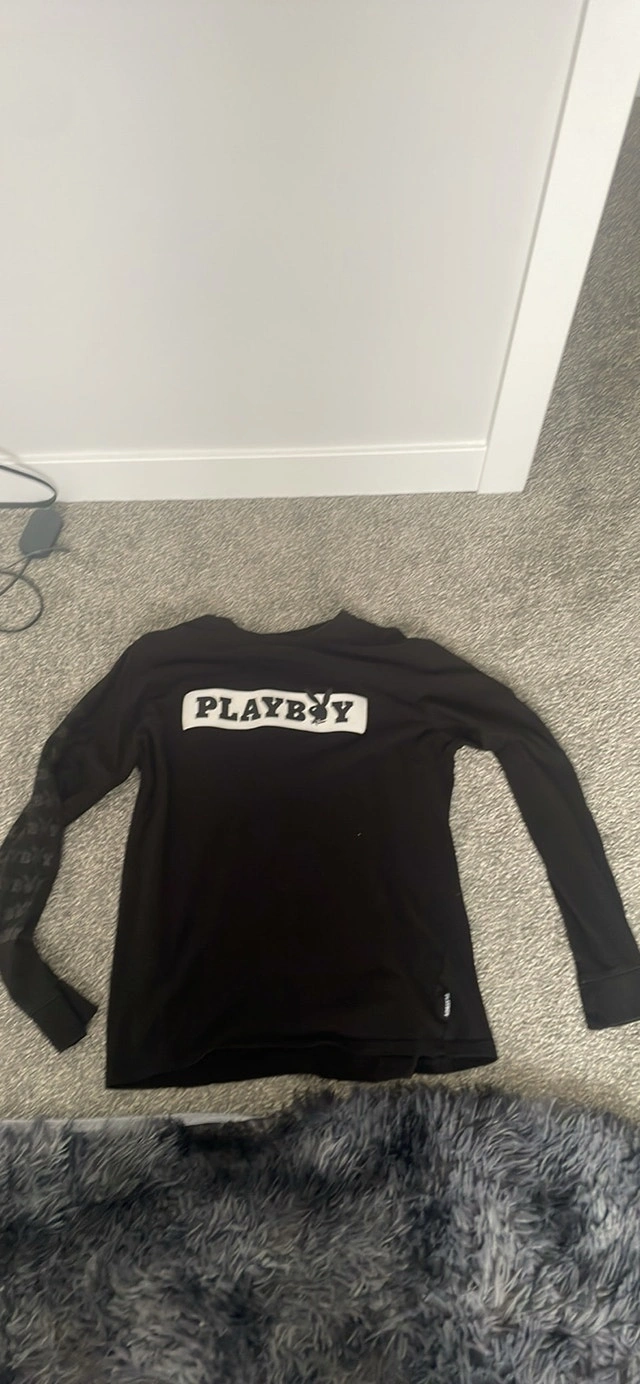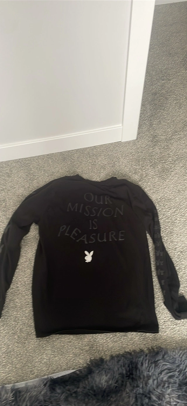 I'm selling a used Playboy long sleeve shirt in black. It's a stylish piece with the iconic Playboy logo on the front and the words 'Our Mission Is Pleasure' on the back. The shirt shows some signs of wear, but is still in good condition. It's a real conversation starter, especially when paired with a bit of cheeky confidence! If the ad is up, the shirt is available.