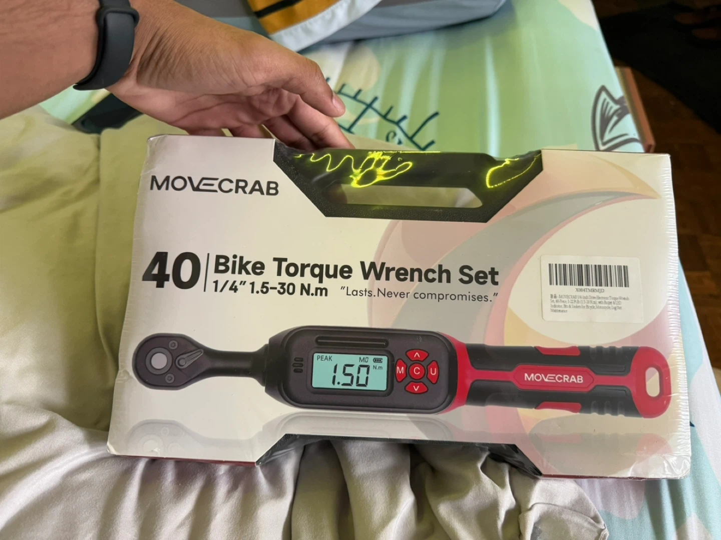 This is a MOVE CRAB 40 piece bike digital torque wrench set. It features a 1/4-inch drive and a torque range of 1.5-30 Nm. The set includes bits and sockets for various motorcycle and bike needs.