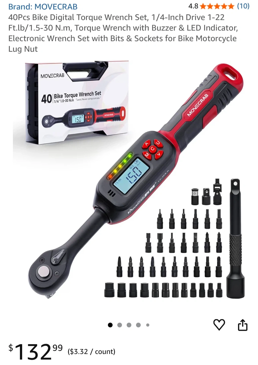 This is a MOVE CRAB 40 piece bike digital torque wrench set. It features a 1/4-inch drive and a torque range of 1.5-30 Nm. The set includes bits and sockets for various motorcycle and bike needs.