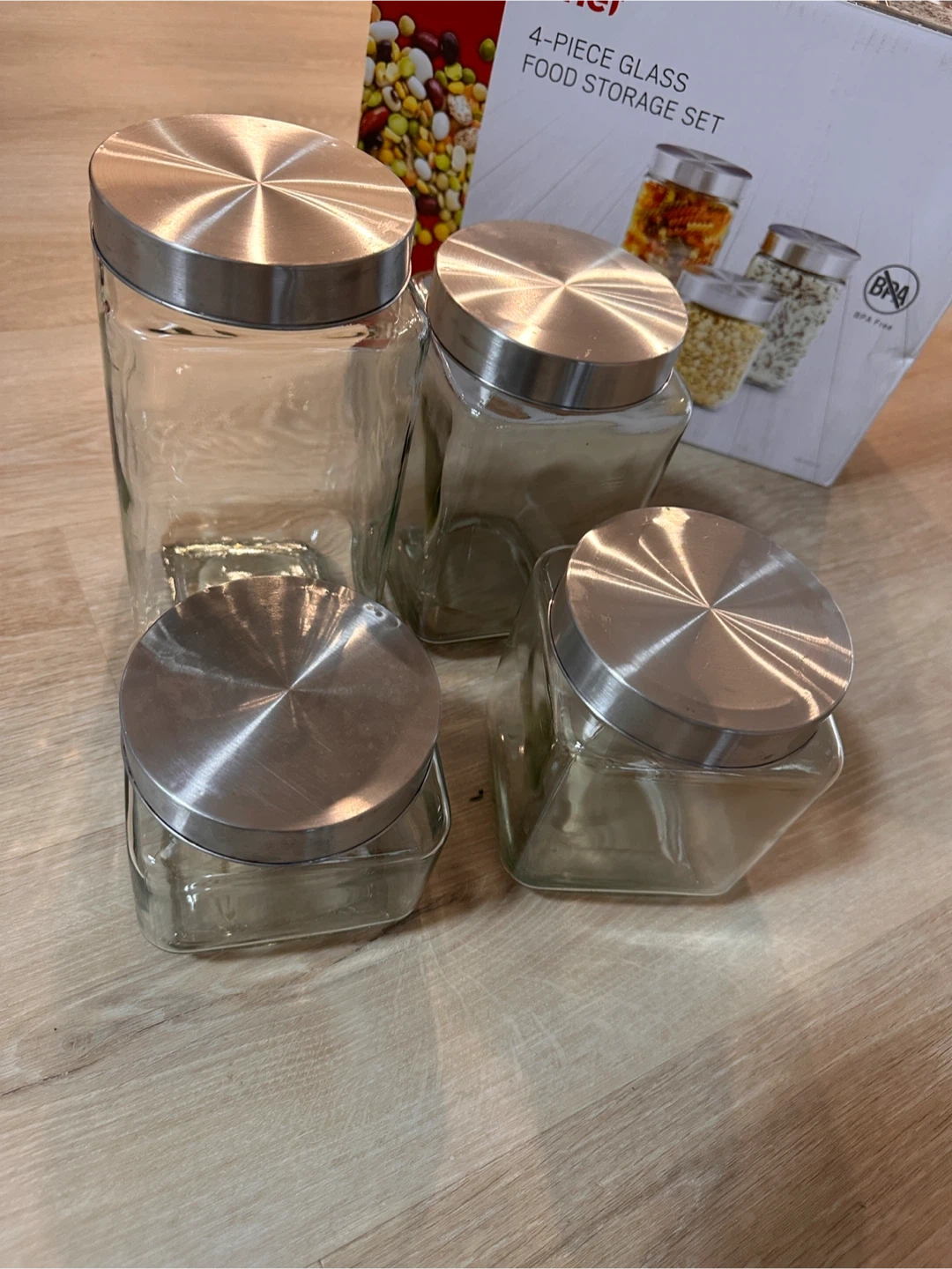 Master Chef 4-piece glass food storage set with lids. Includes containers for storing pantry staples. BPA free.