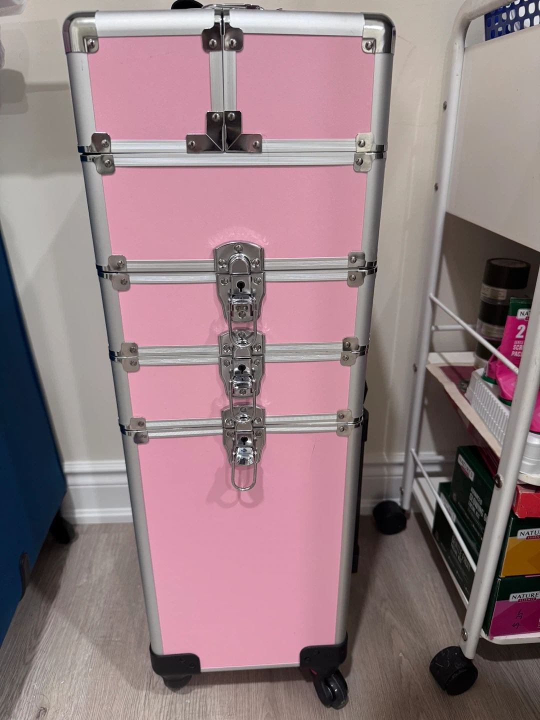 This is a pink rolling makeup train case. It features multiple compartments for organization. It has a retractable handle and wheels for easy transport.
