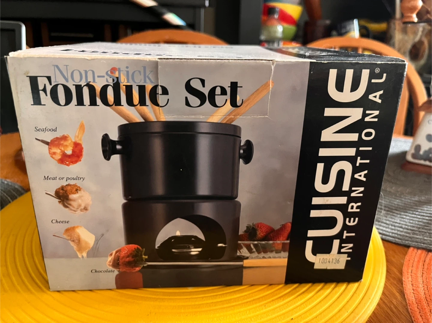 This is a non-stick fondue set by CUISINE INTERNATIONAL. It's suitable for seafood, meat, cheese, or chocolate fondues. The set includes the pot, burner holder, and skewers.