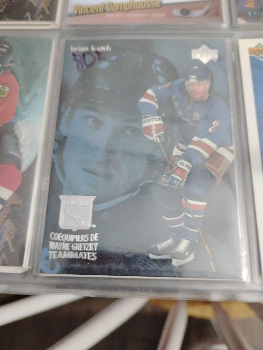This is a 1999-2000 Upper Deck hockey card featuring Brian Leetch as part of the Wayne Gretzky Teammates set. The card is in good condition. It's a great addition for any hockey card collector!