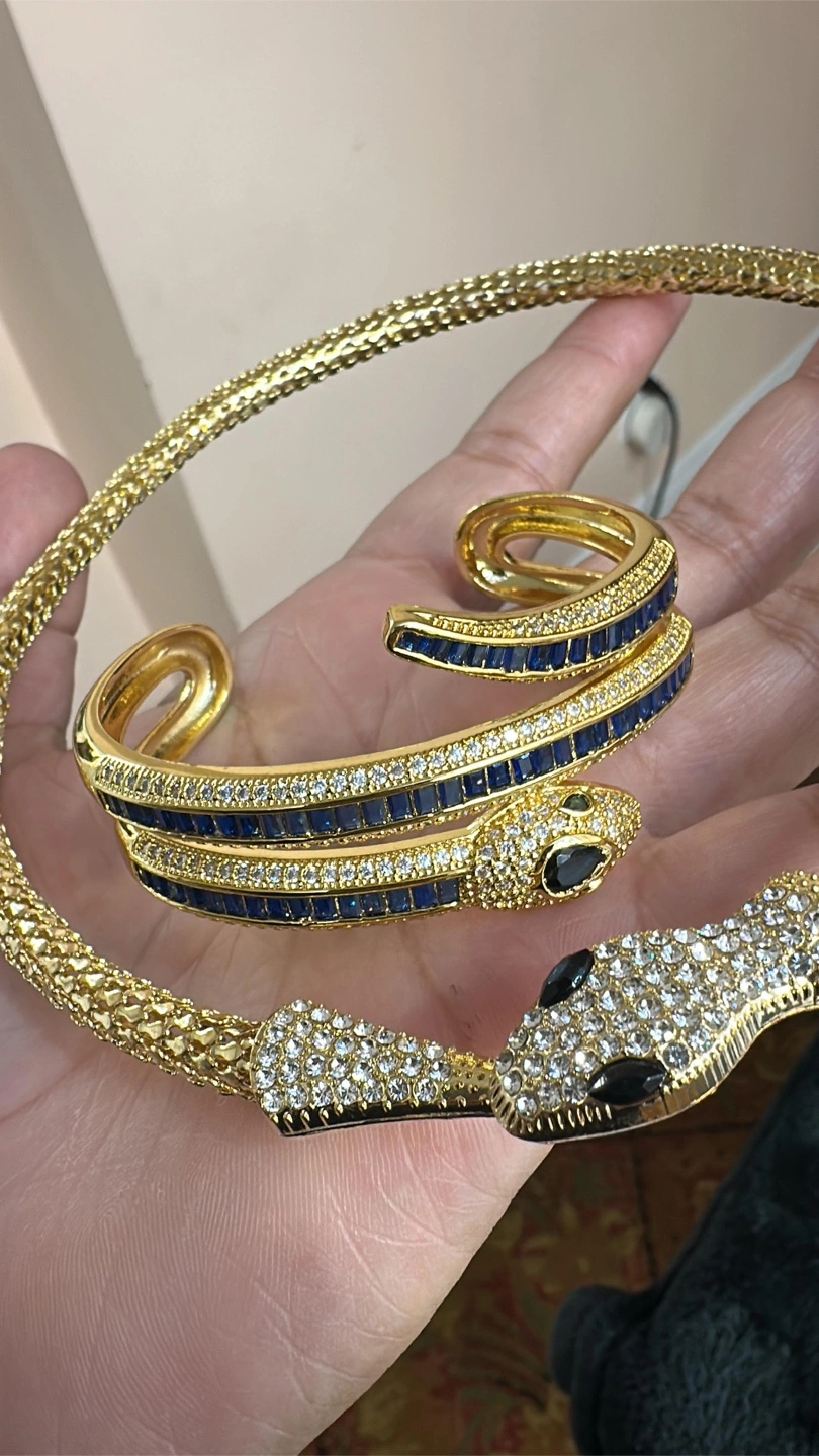 Selling a beautiful gold-toned snake necklace and cuff bracelet set. The necklace and bracelet feature intricate detailing and are adorned with sparkling stones. Perfect for adding a touch of glamour to any outfit!