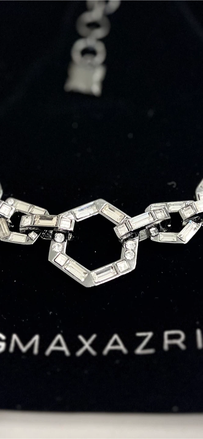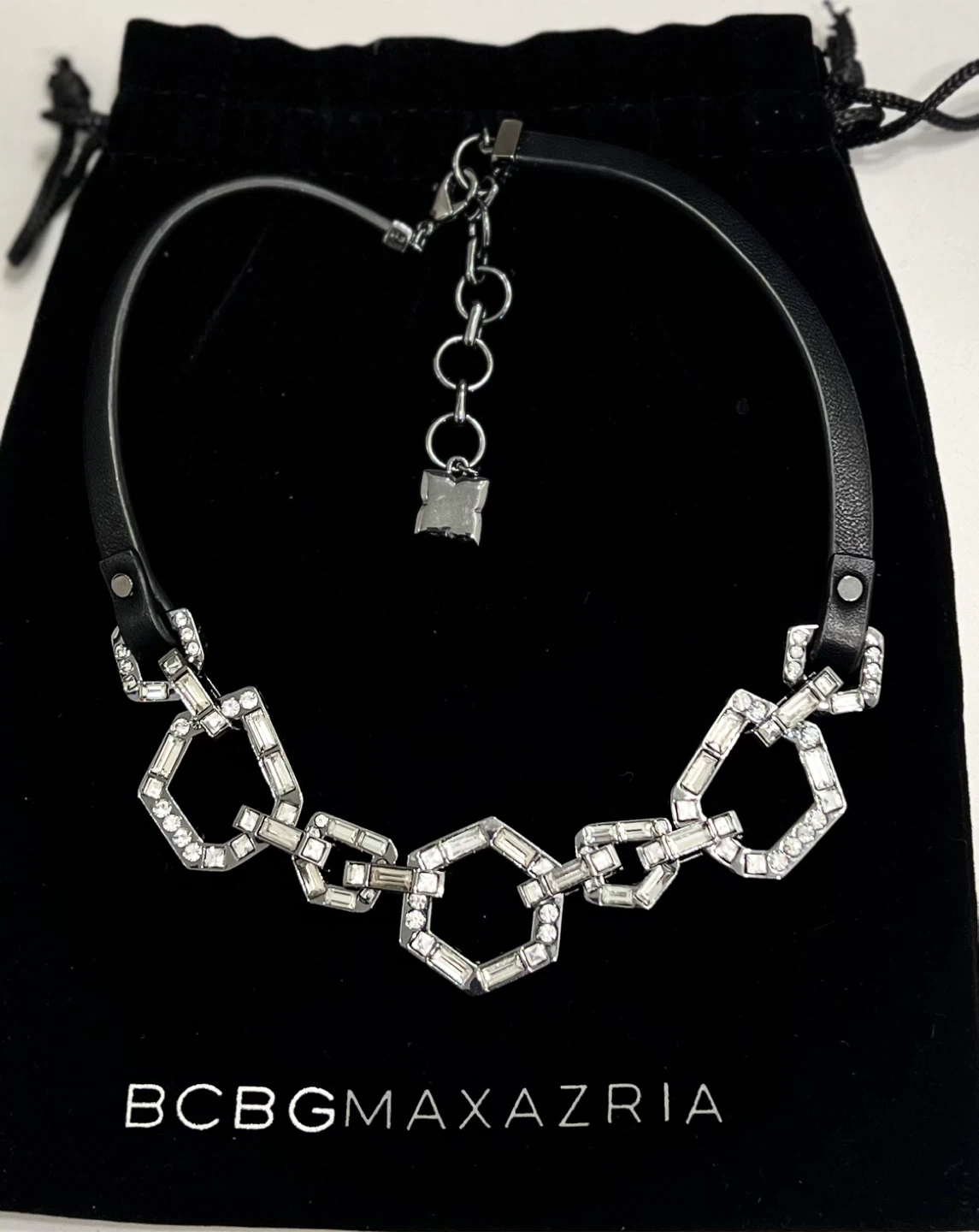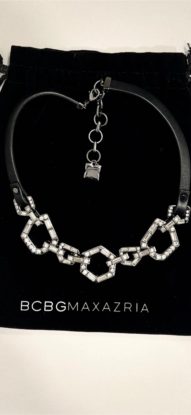 This BCBGMAXAZRIA choker necklace features a faux leather band with a statement chain made of interlocking geometric shapes. It's adorned with clear baguette-style crystals and small round crystals. Comes with a drawstring pouch for storage.