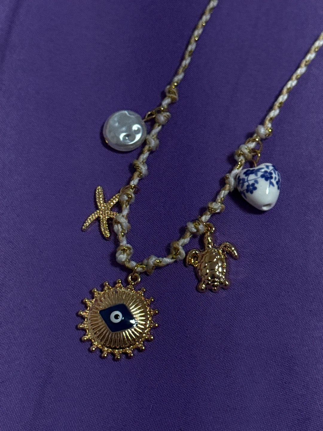 👉Gold-tone necklace with a white braided cord. It features multiple charms including a pearl, starfish, evil eye sun, turtle, and a blue and white patterned heart.