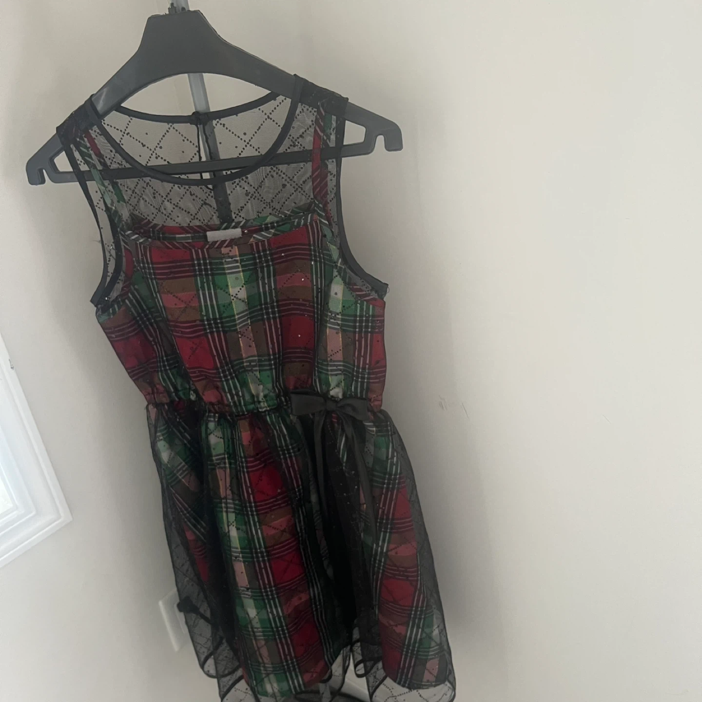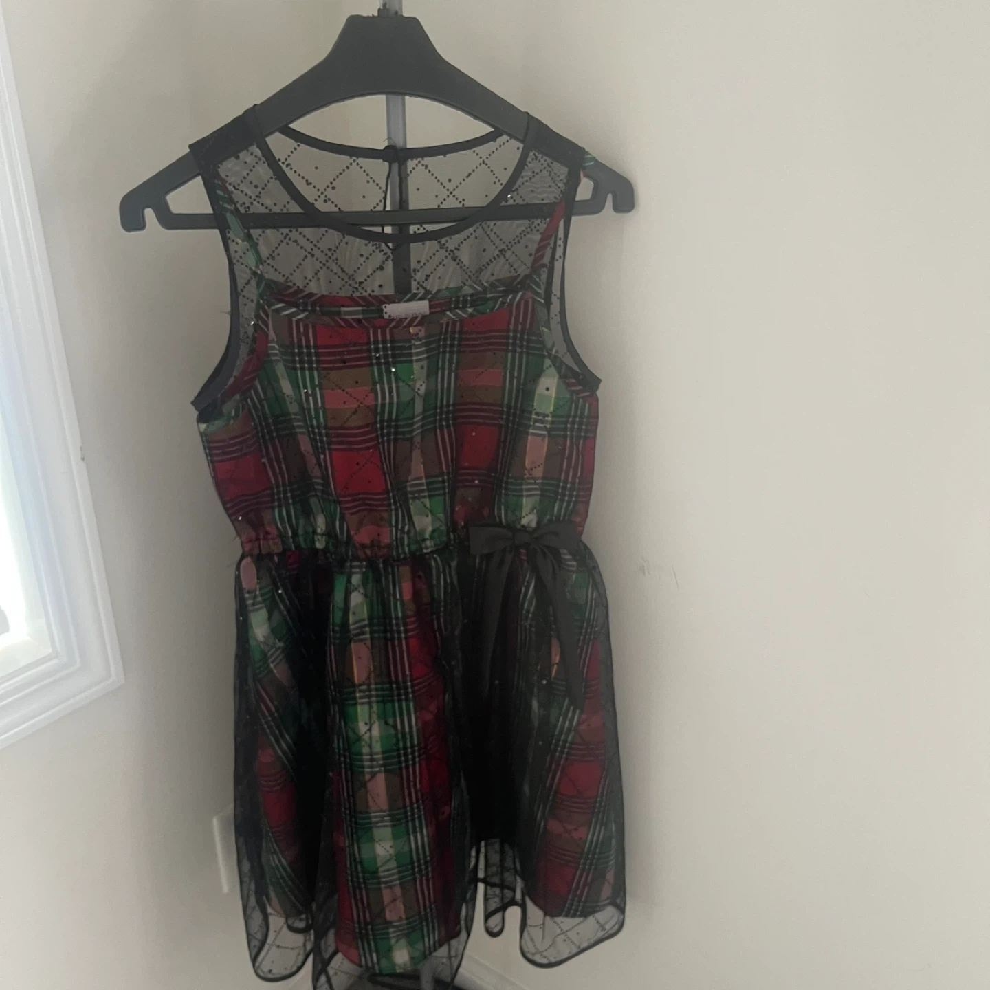 This is a sleeveless girls dress featuring a red, green, and gold plaid pattern with sparkle details. It has a black lace overlay on the yoke and a black ribbon tie at the waist. The skirt also has a black lace overlay. Perfect for holiday events!