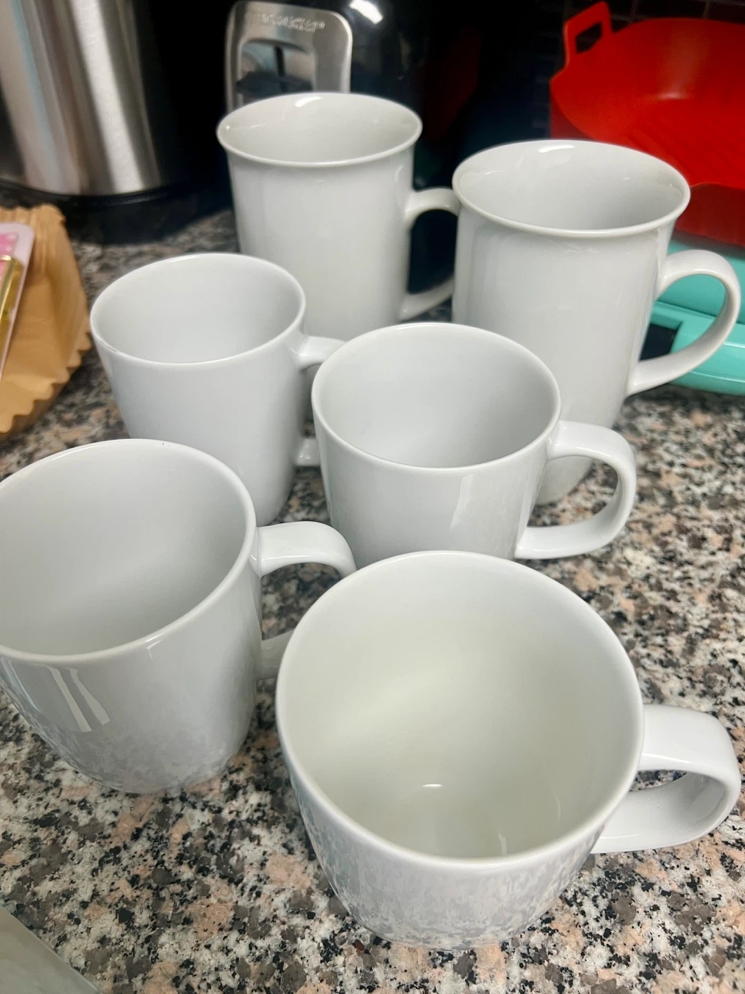 This is a set of six white ceramic mugs, 4 standard-size ones and 2 bigger / taller ones. They're white with a simple design, made of durable ceramic material.