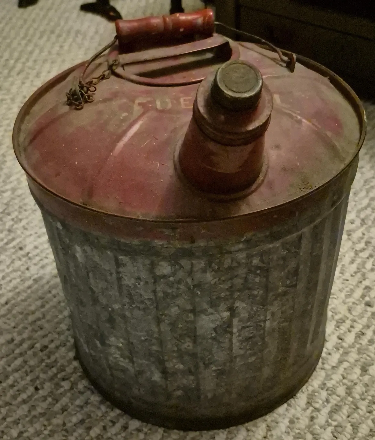 This is an old metal fuel can. It's red on top with a galvanized metal body. It has a wooden handle and a metal spout. It looks like it might have had some lettering on it.