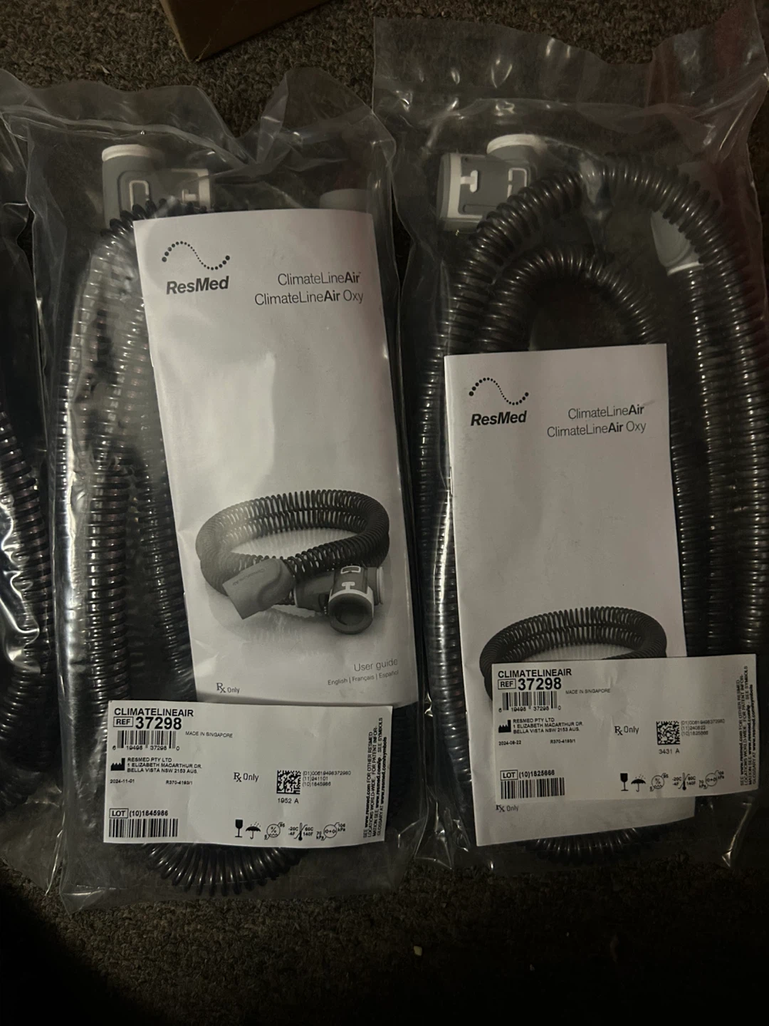 This is a new ResMed ClimateLineAir Oxy heated tubing for CPAP machines. It's part number 37298 and made in Singapore. Includes user guide. Manufacturing date is 2024-11-01.