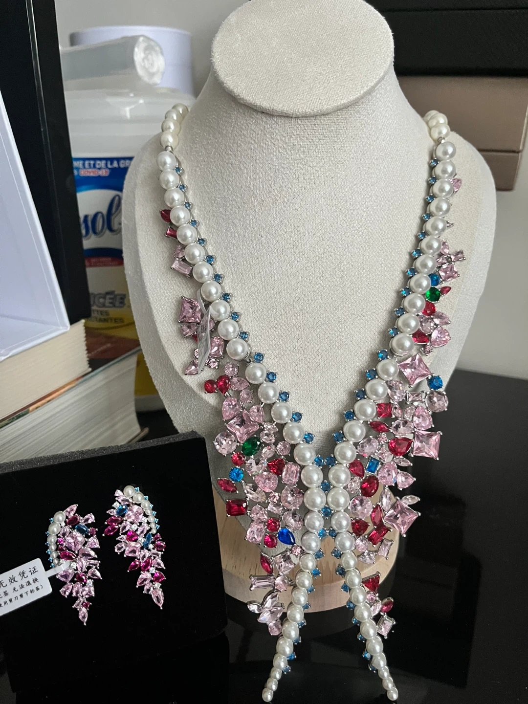 A stunning statement necklace and matching earrings set, featuring faux pearls and a colourful assortment of sparkling crystals. The set includes a necklace with a cascading design and a pair of elegant drop earrings. This dazzling jewellery would be perfect for special occasions and adds a pop of glamour to any outfit!