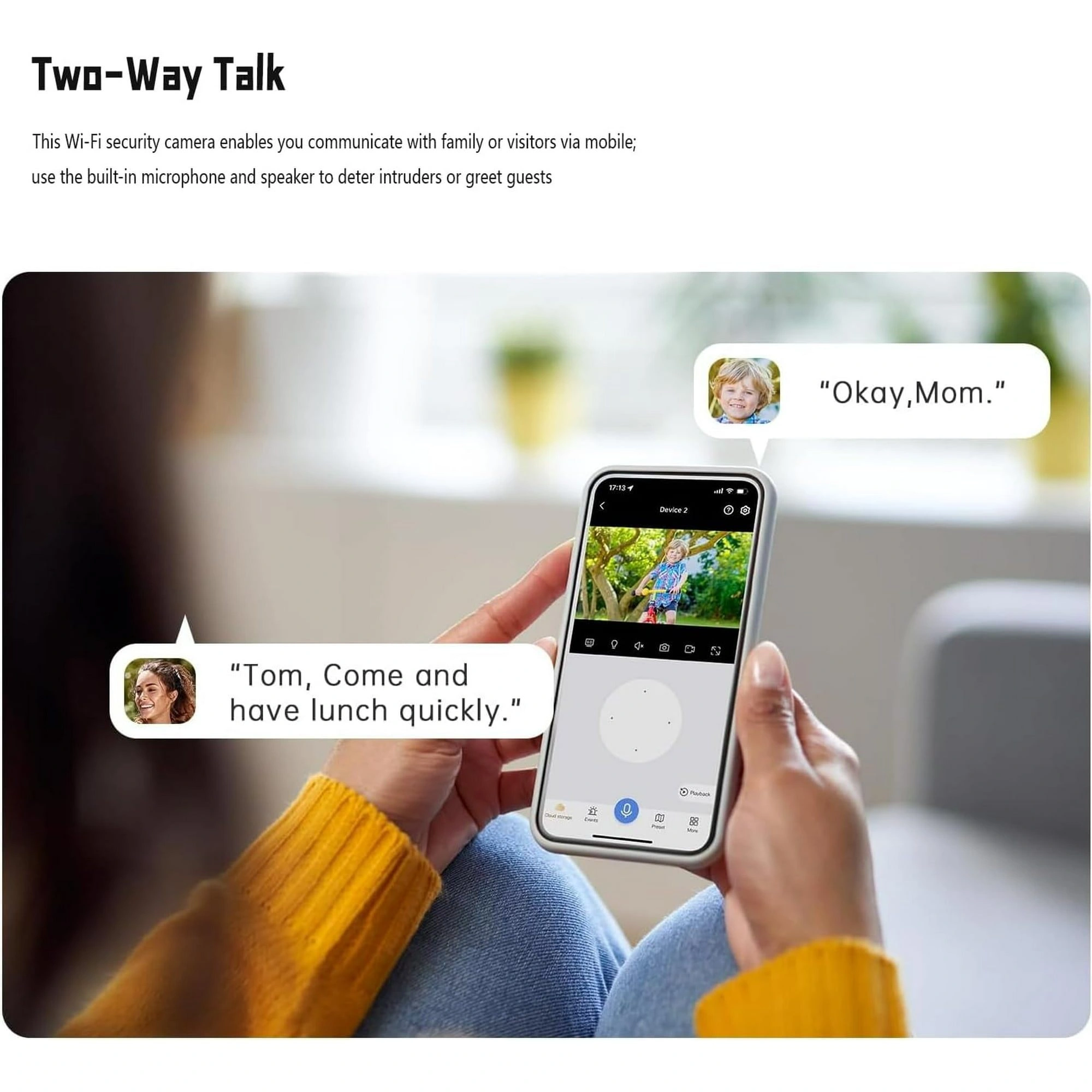 Interactive Communication: Includes a built-in microphone and speaker for two-way audio communication and can trigger an audible alarm with white light upon motion detection.
