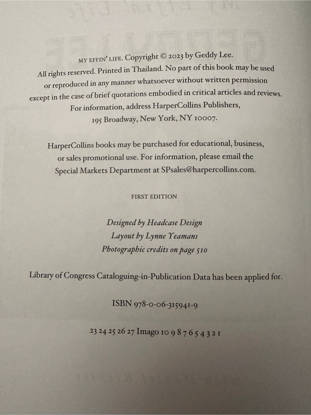 Excellent condition! Selling a hardcover First Edition copy of Geddy Lee's autobiography, "My Effin' Life"! It's a great read for any Rush fan or anyone interested in a rock and roll memoir to add to their reading collection!