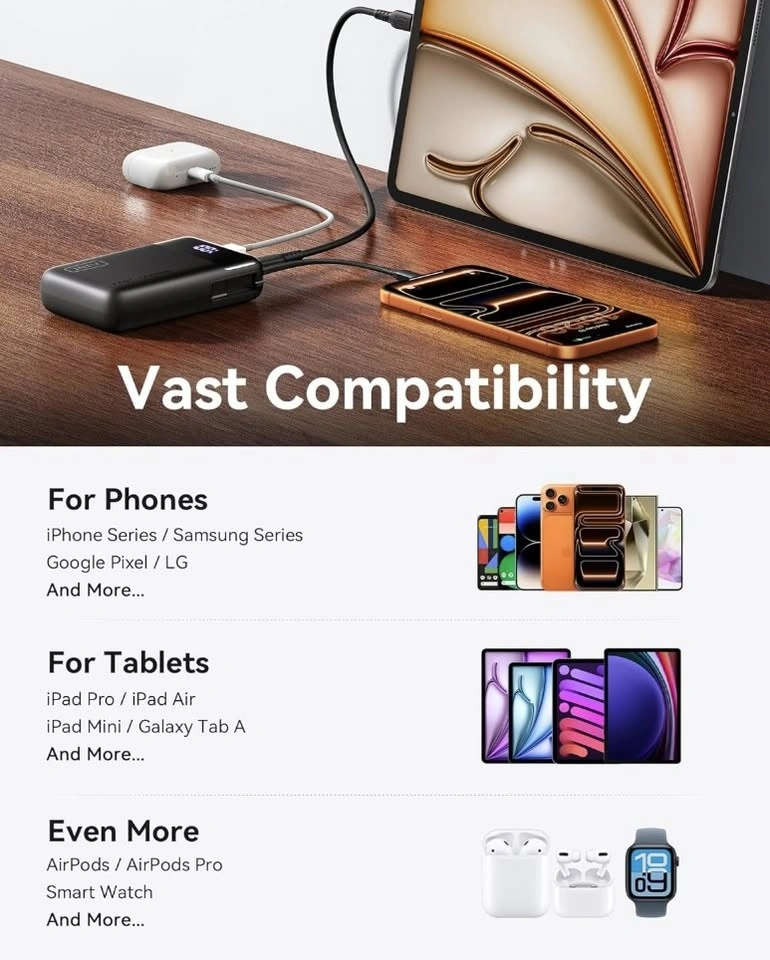 45W Full-Speed Charging for iPhone 17 & Samsung S25: Delivering up to 45W output, this power bank supports PD, QC, and other fast-charging protocols. Charge your iPhone 16 to 70% in just 25 minutes, or your Samsung S25 Ultra to 80%.