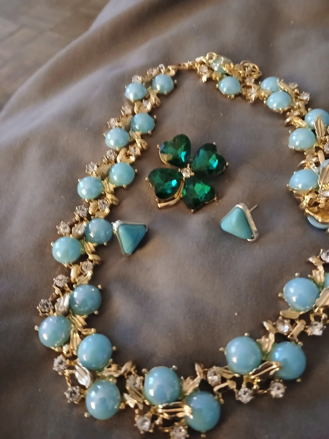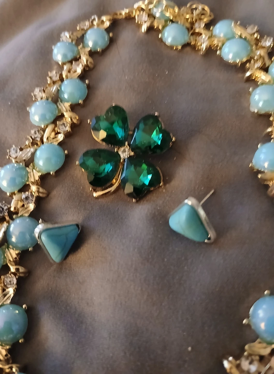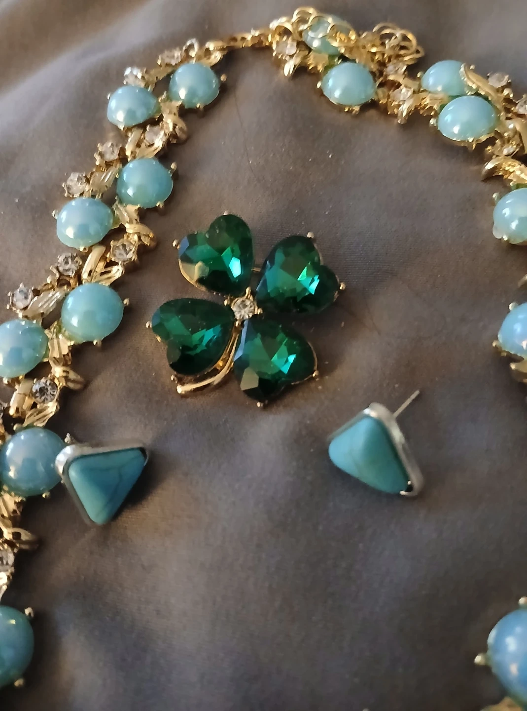 Gold tone necklace and earring set featuring blue beads and clear rhinestones. Includes a green clover-shaped brooch with emerald-like stones. Perfect for adding a touch of vintage charm to any outfit!