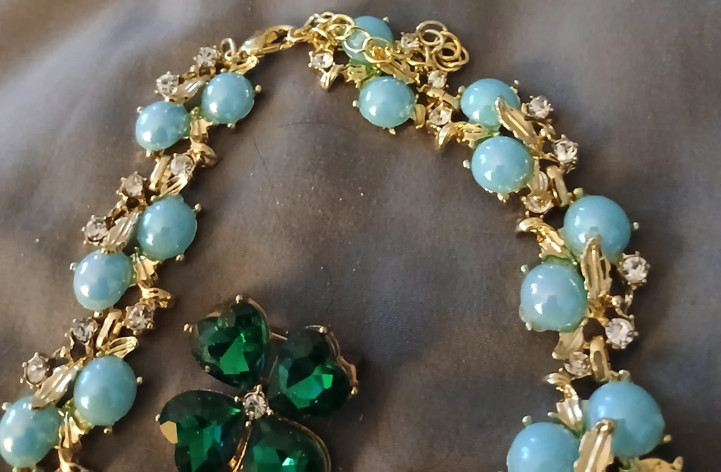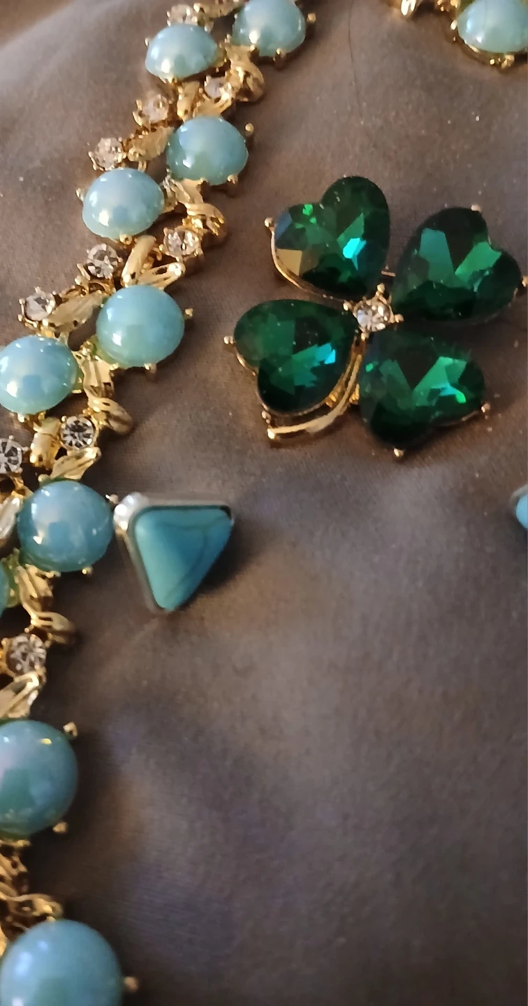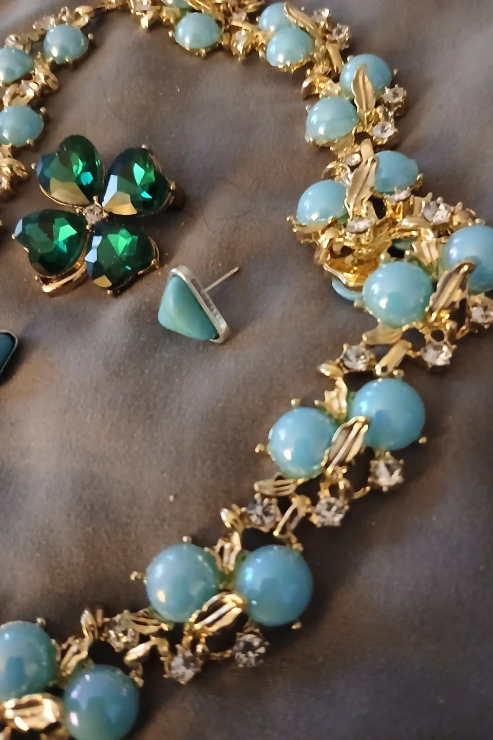 Gold tone necklace and earring set featuring blue beads and clear rhinestones. Includes a green clover-shaped brooch with emerald-like stones. Perfect for adding a touch of vintage charm to any outfit!