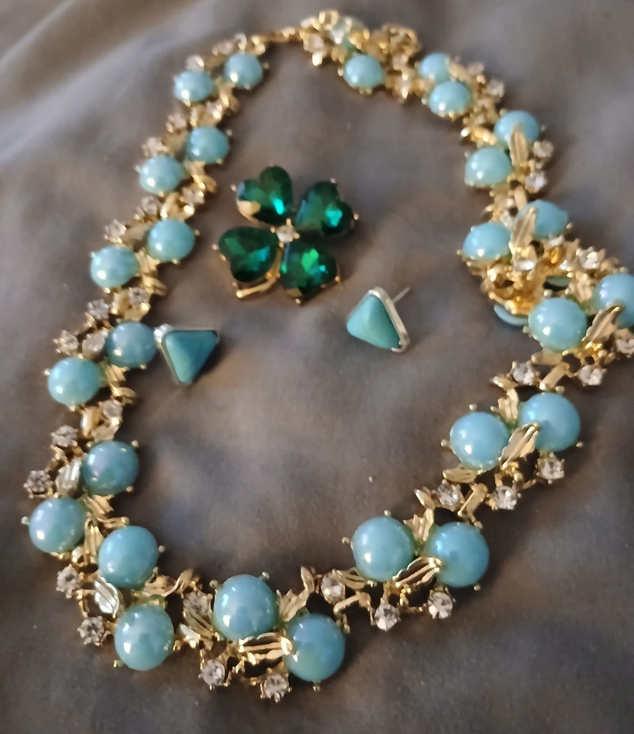 Gold tone necklace and earring set featuring blue beads and clear rhinestones. Includes a green clover-shaped brooch with emerald-like stones. Perfect for adding a touch of vintage charm to any outfit!