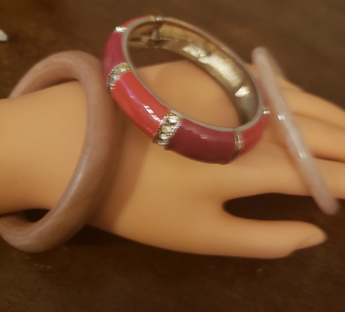 A set of three bangles. Features a red and maroon enamel bangle with rhinestone accents. Also includes a wooden bangle and a clear plastic bangle. These bangles add a touch of flair to any outfit!
