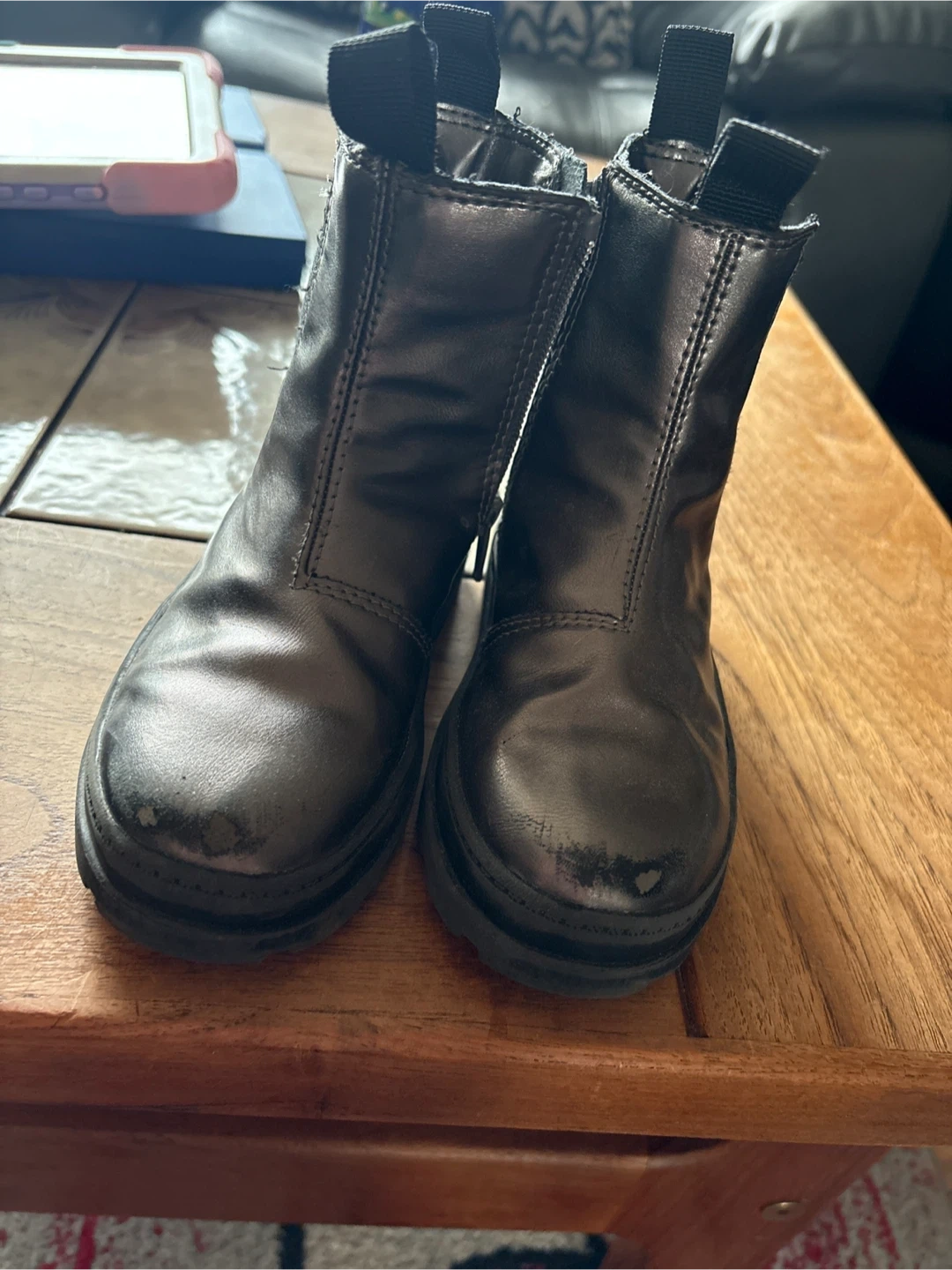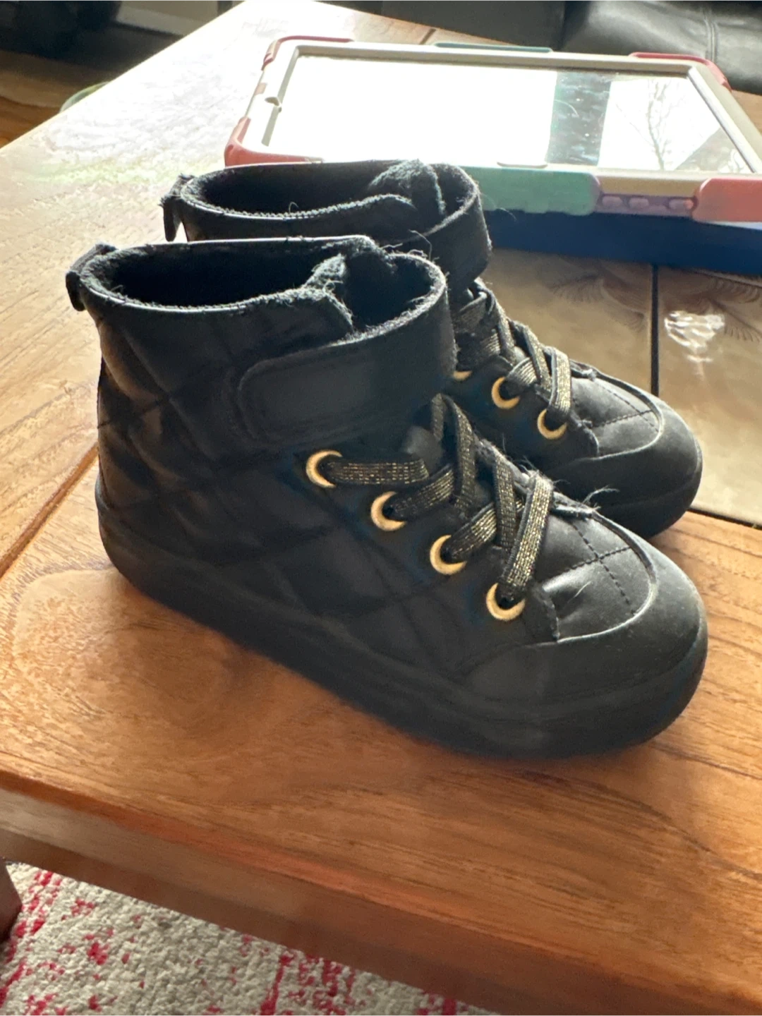 Selling a couple pairs of kids' boots. One pair is a Chelsea style in a metallic black colour. The other pair is a black quilted high top style with gold accents. Both are in used condition.