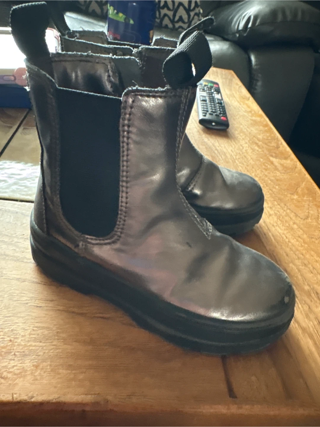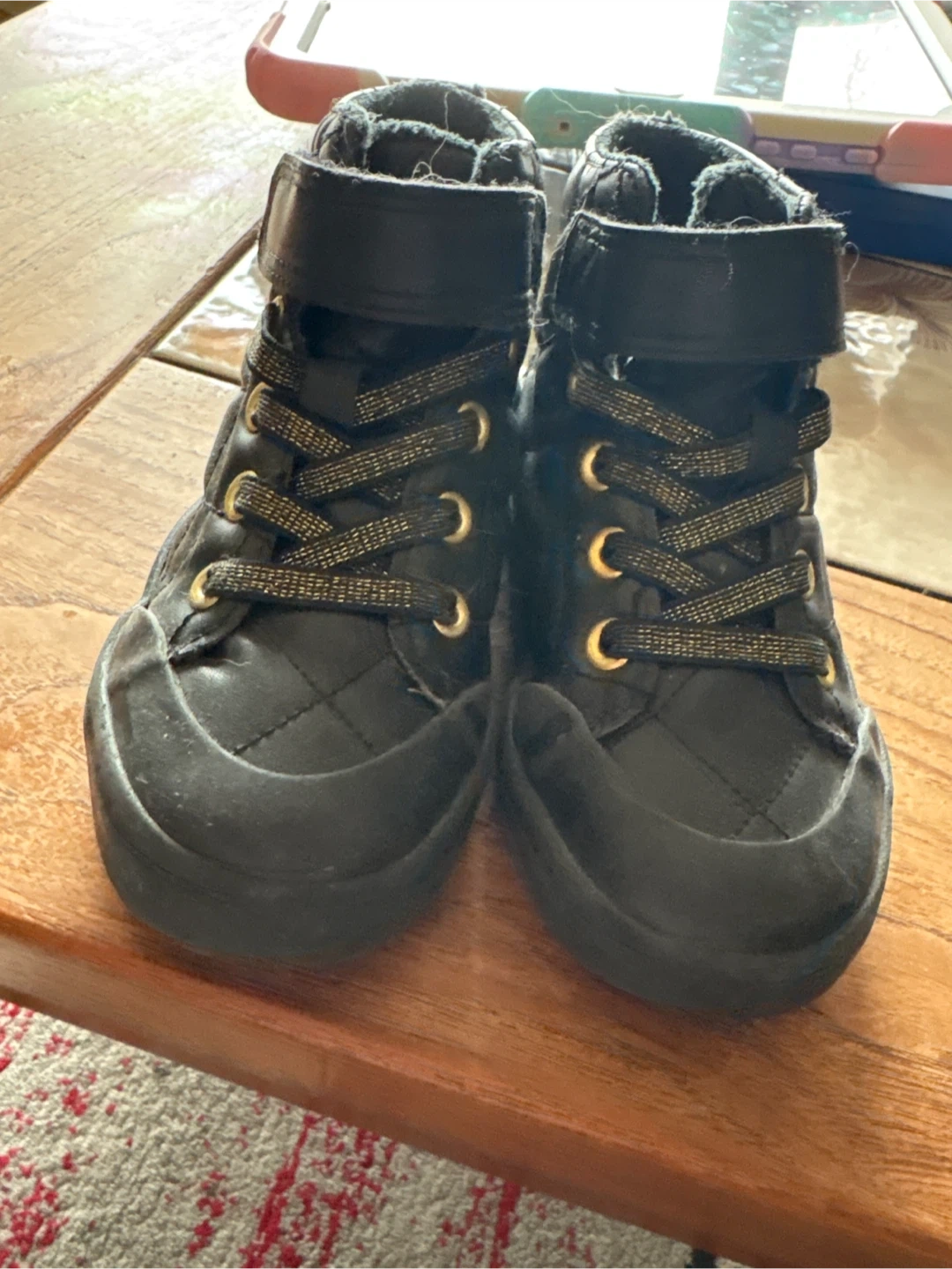 Selling a couple pairs of kids' boots. One pair is a Chelsea style in a metallic black colour. The other pair is a black quilted high top style with gold accents. Both are in used condition.