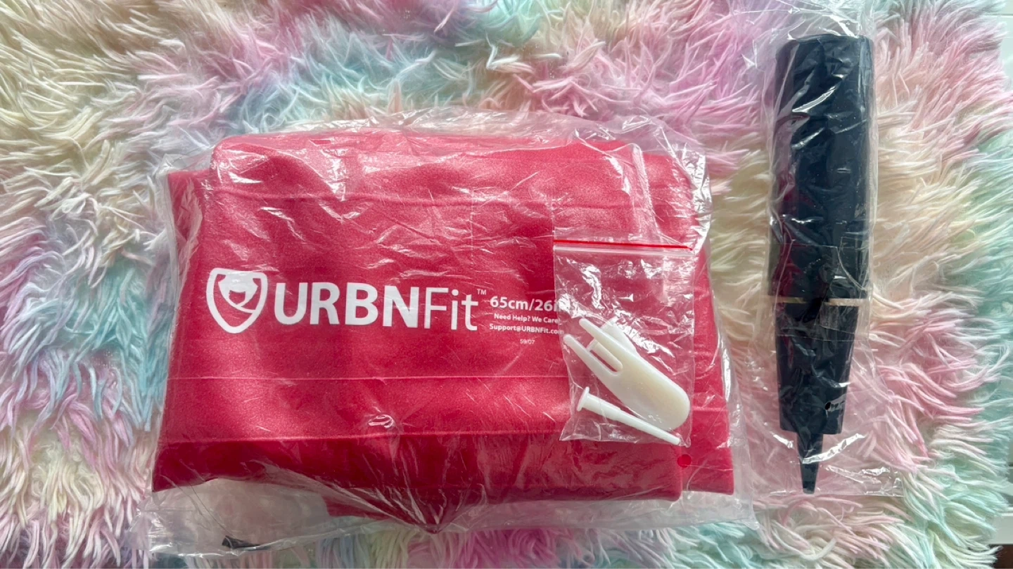 URBNFit exercise ball in red, measuring 65cm/26in. Includes pump and repair kit. Ideal for core strengthening and fitness routines.