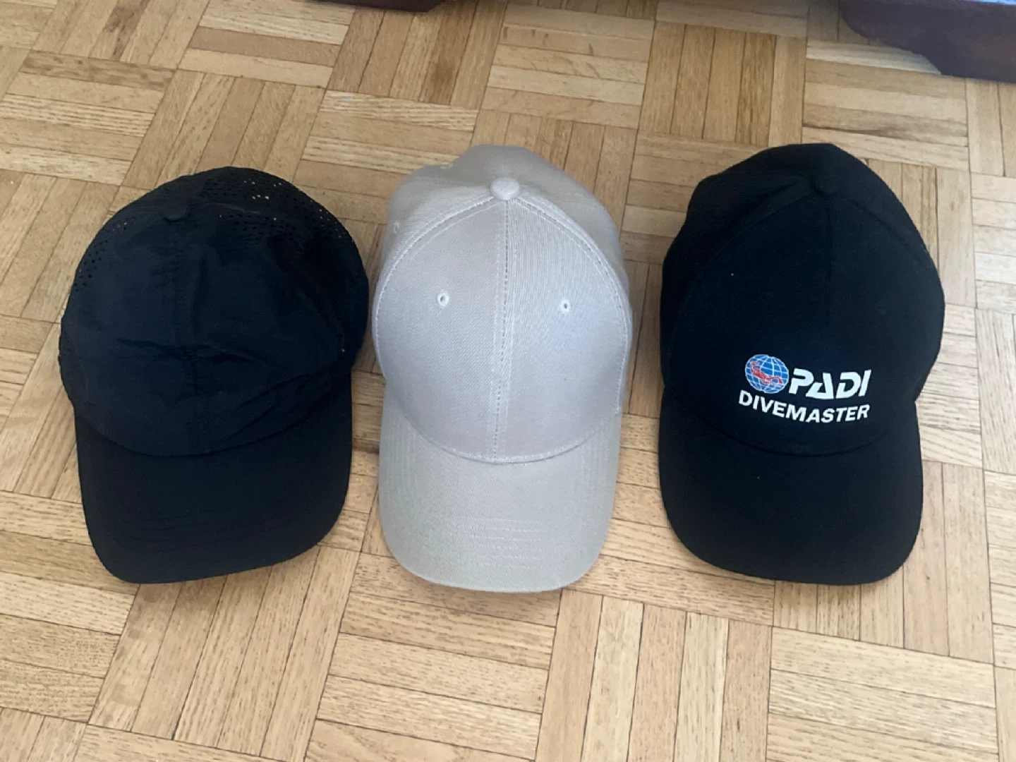 Selling a bundle of three baseball caps. Includes a black cap with perforated panels, a solid tan cap, and a black cap with PADI Divemaster embroidery. These caps offer casual headwear options.
