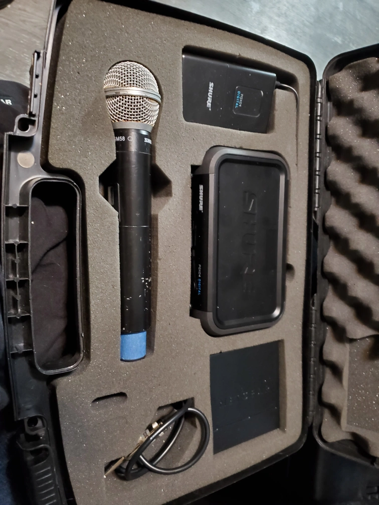 Selling a Shure SM58 wireless microphone system. It comes with the microphone, receiver, and case. Perfect for singers, speakers, or anyone needing a reliable wireless mic!