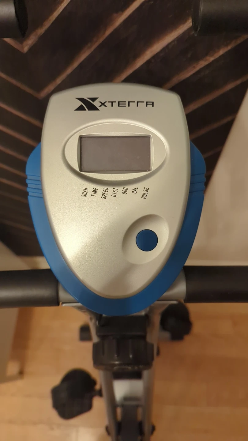 This XTERRA exercise bike is perfect for home workouts. It features a tension control dial with 8 levels, from low to high. The console displays scan, time, speed, distance, calories, and pulse. Get your cardio in!