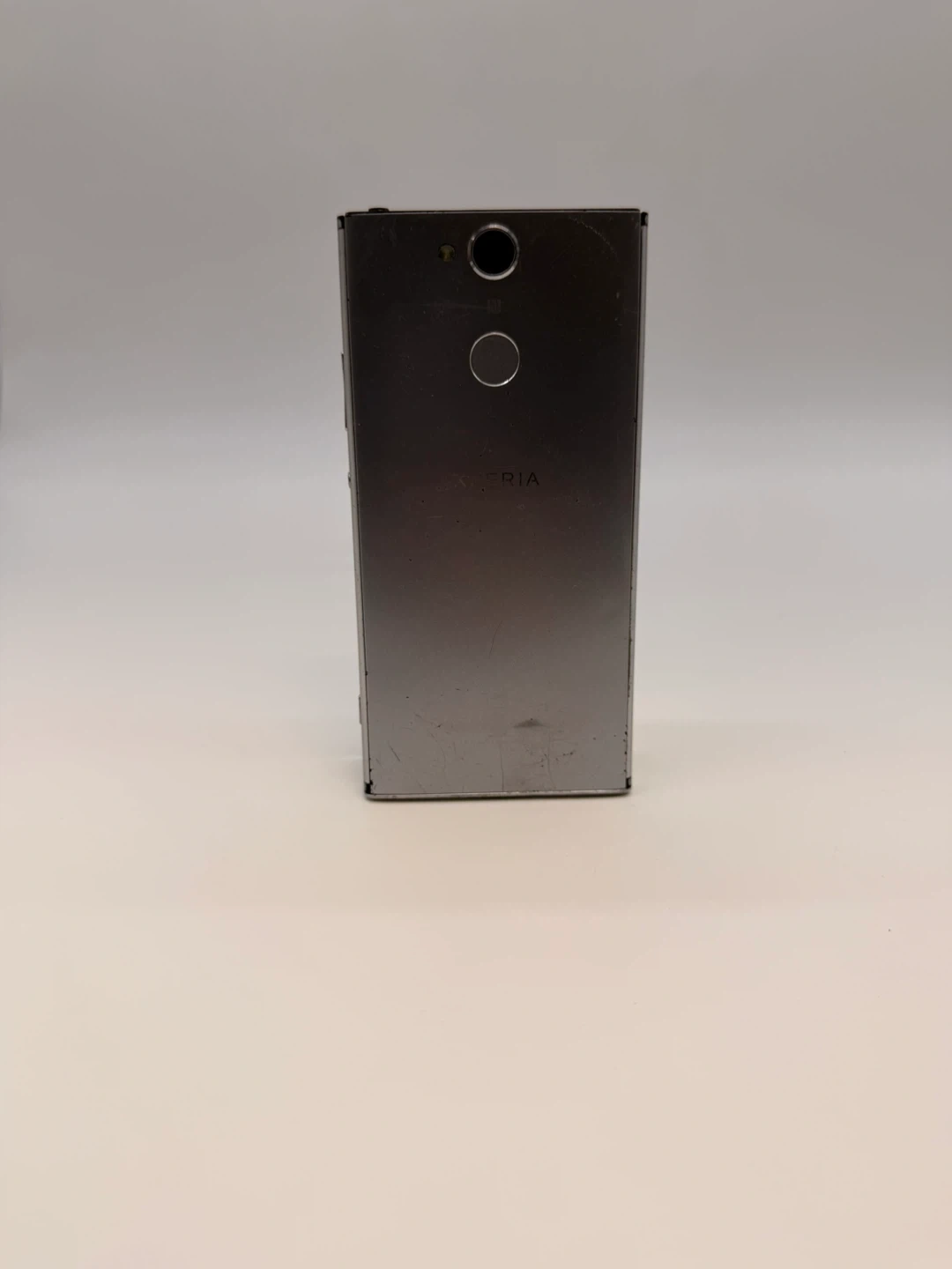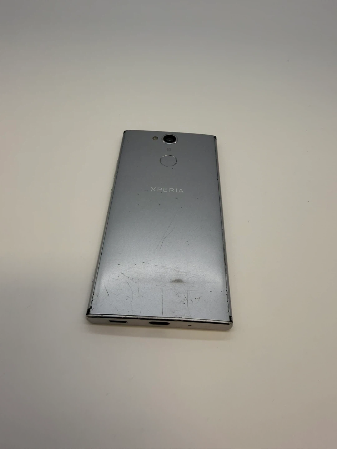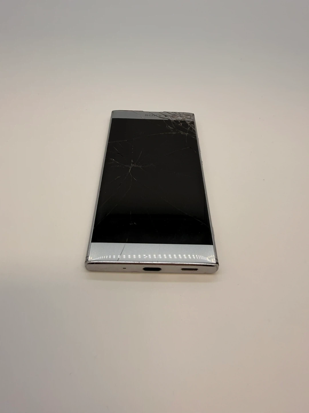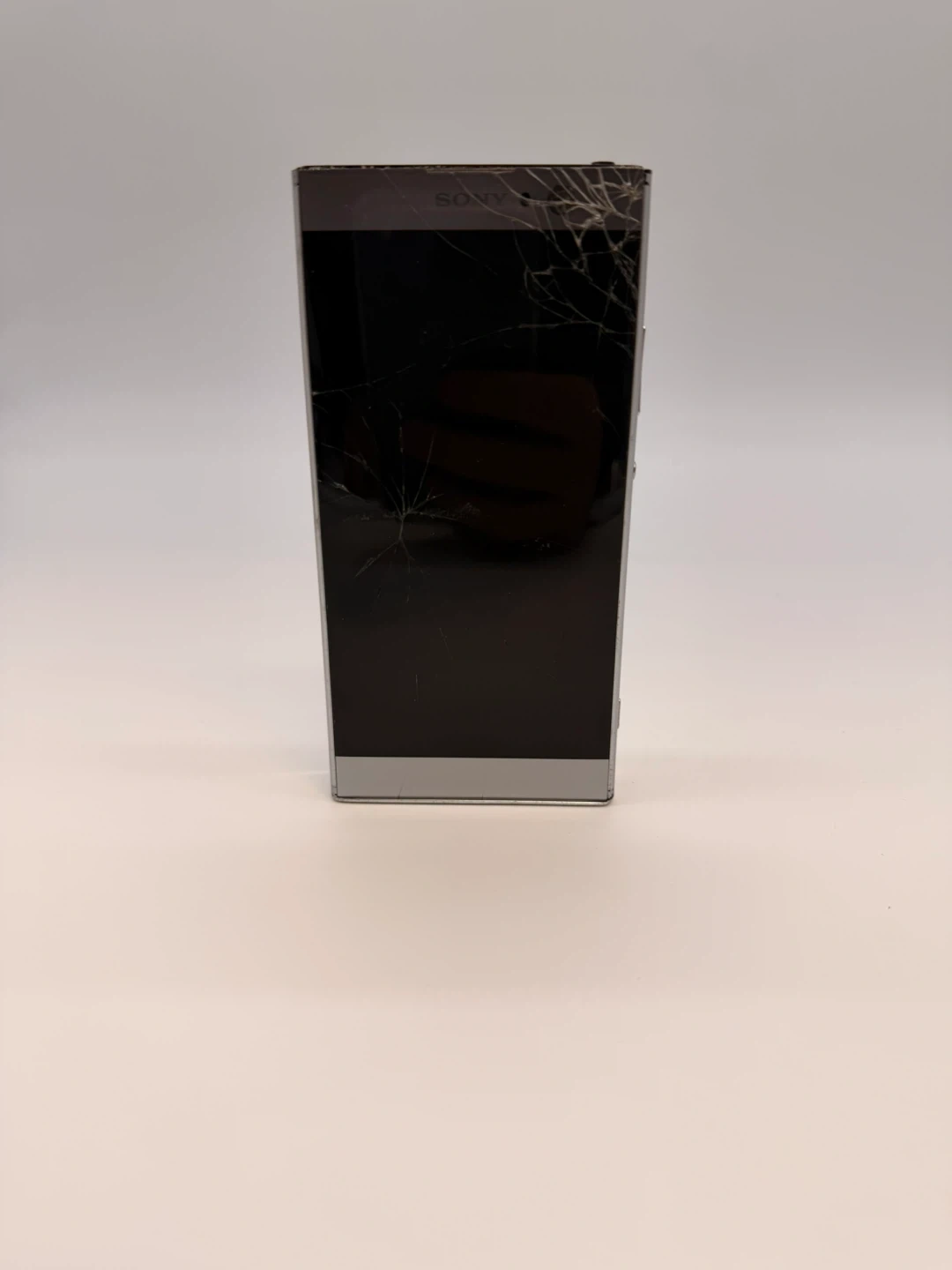 This is a Sony Xperia smartphone. It's silver and shows signs of wear, including scratches on the back and a cracked screen. It's a good option for parts or repair.