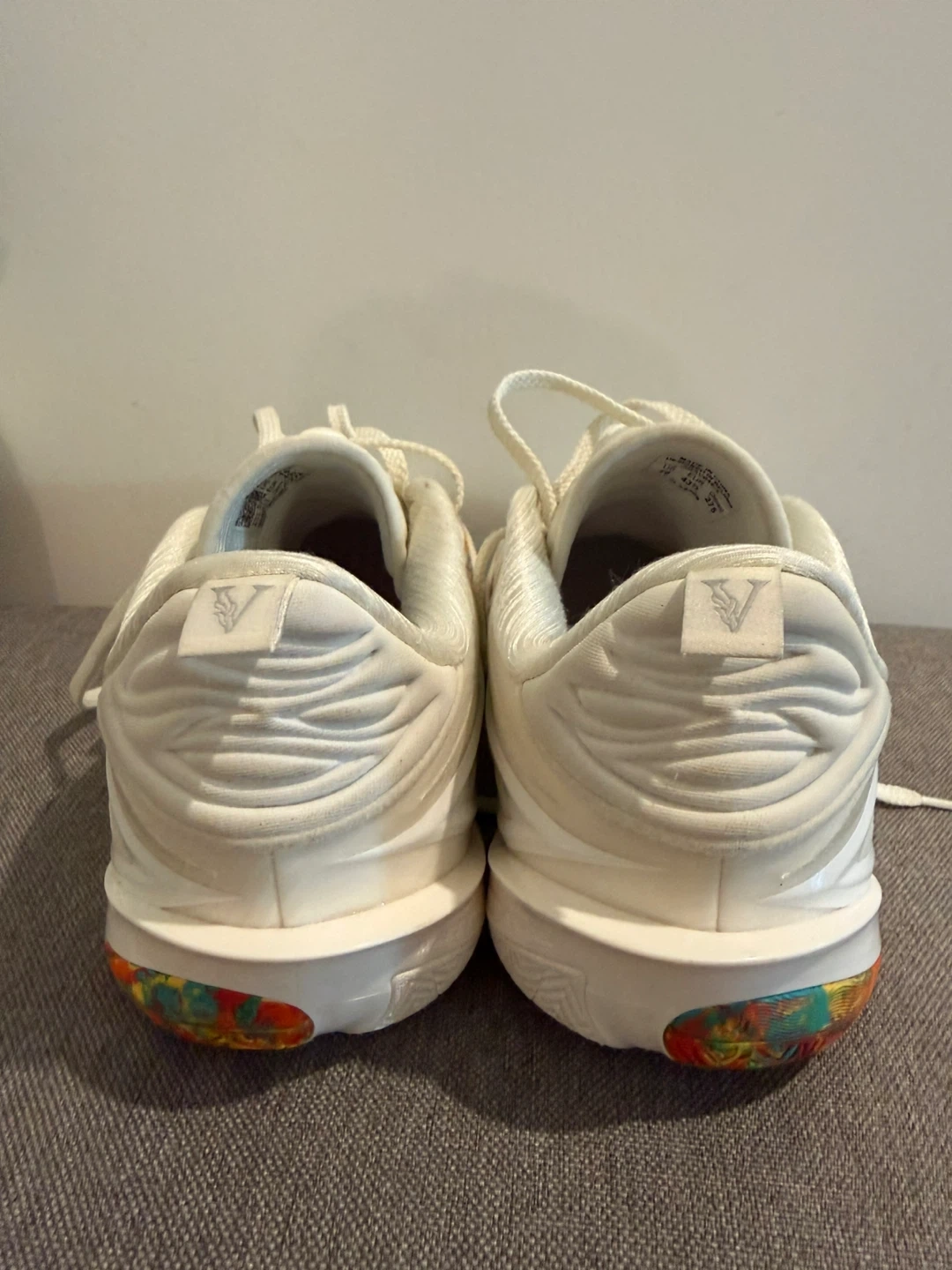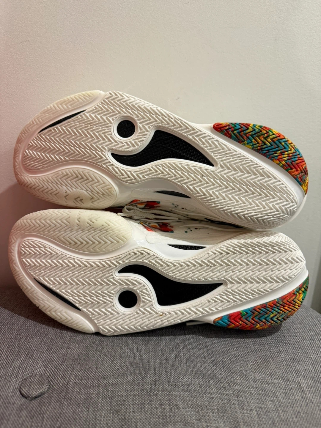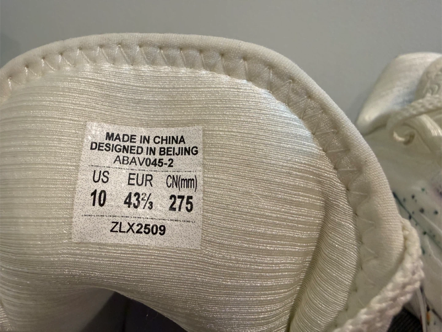 White basketball shoes with colourful abstract accents. Designed in Beijing and made in China. Size is US 10, EUR 43⅓, CN(mm) 275. These shoes are great for playing basketball!