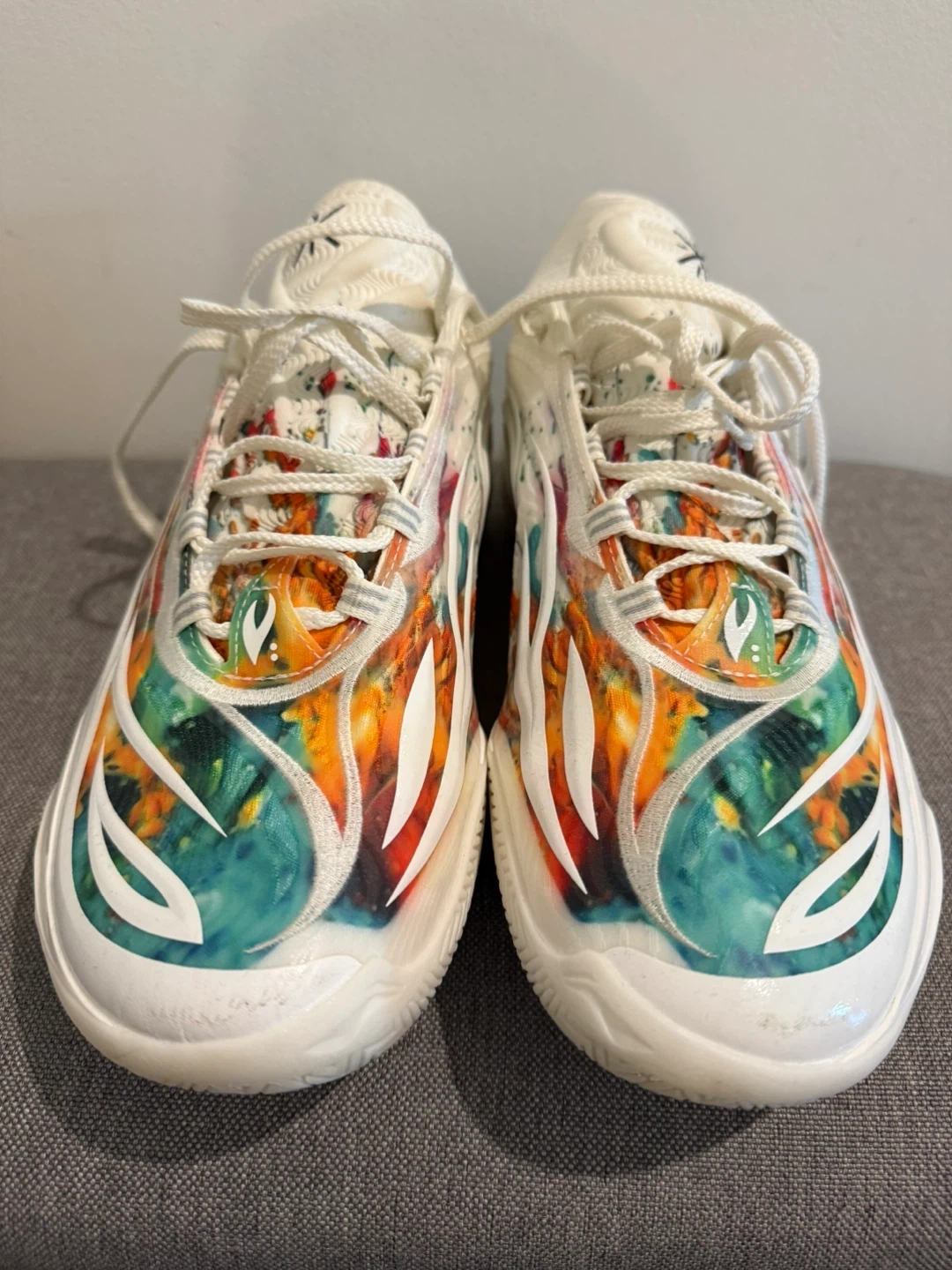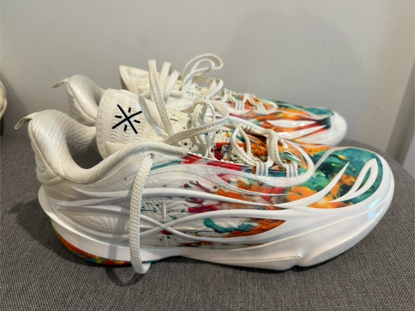 White basketball shoes with colourful abstract accents. Designed in Beijing and made in China. Size is US 10, EUR 43⅓, CN(mm) 275. These shoes are great for playing basketball!