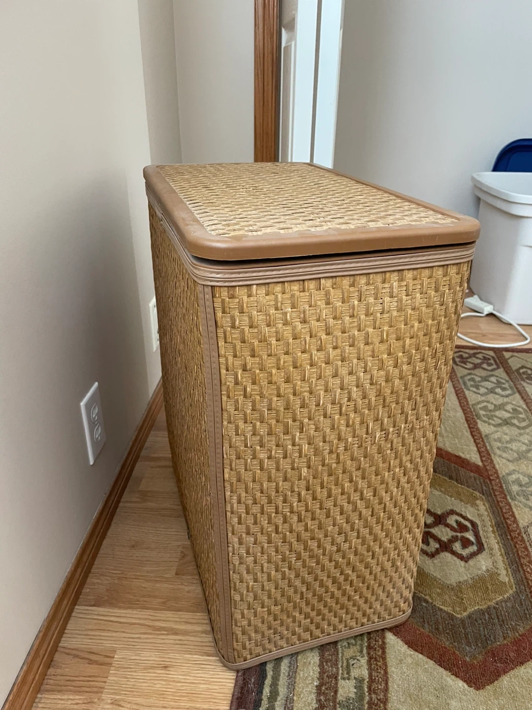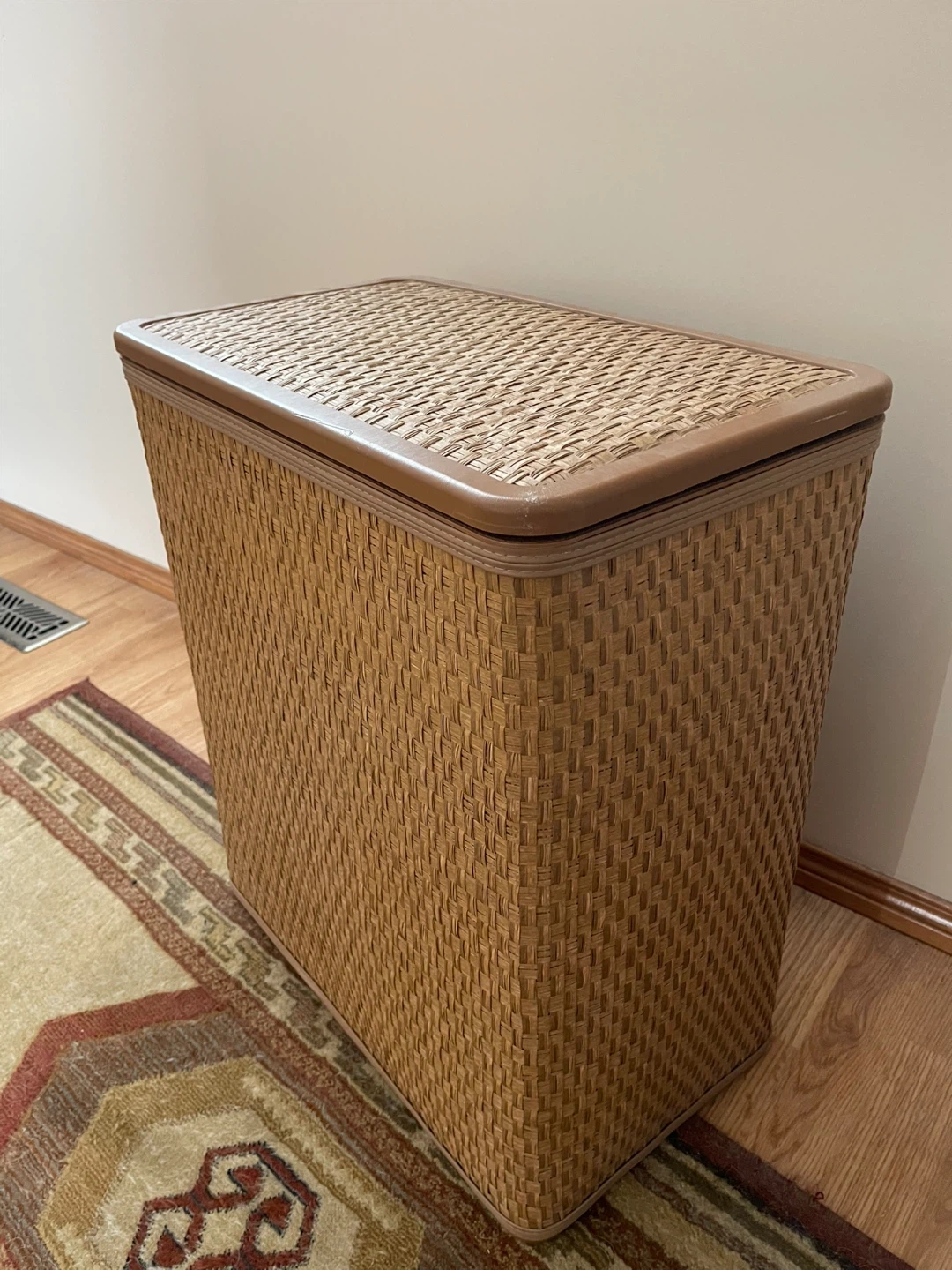 A woven wicker laundry hamper, perfect for any bedroom or bathroom. It's got a hinged lid to keep clothes out of sight. The interior has a liner, and the construction is durable.