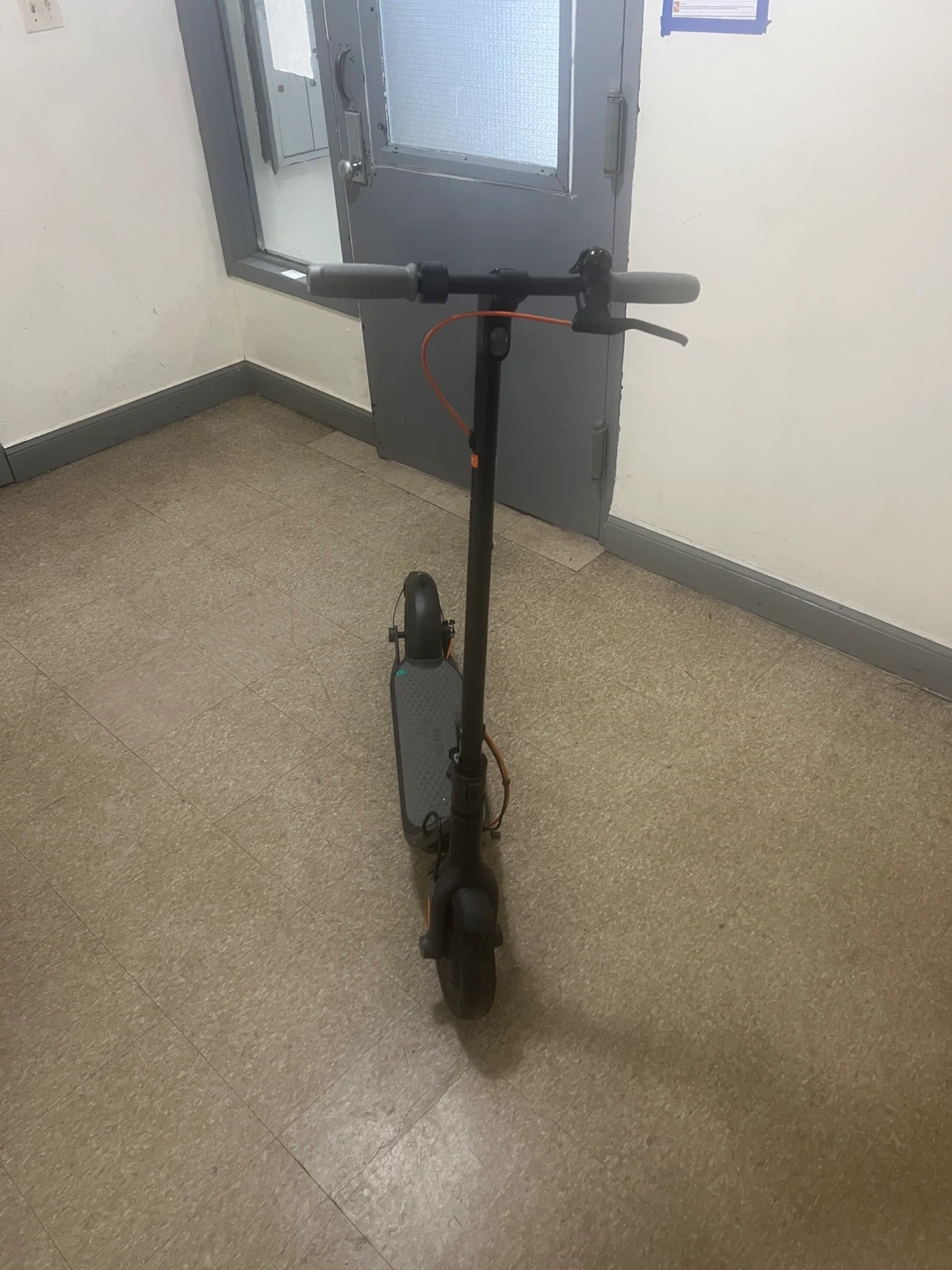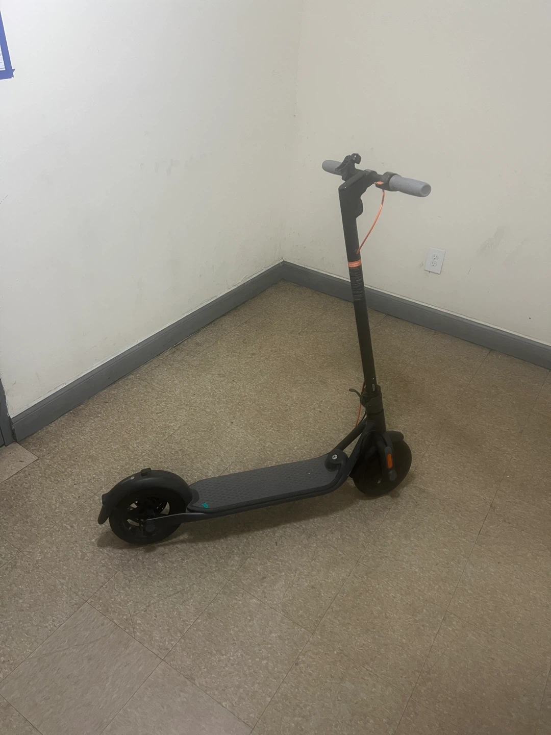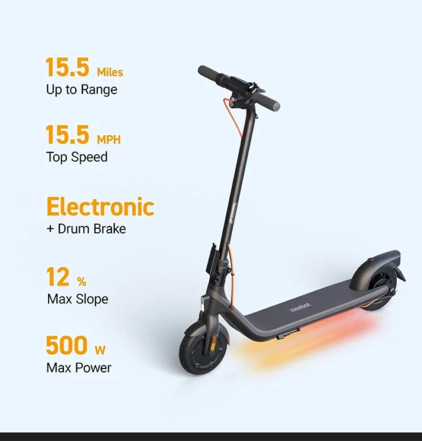 This is a Ninebot electric scooter. It's gray with orange accents. It features electronic and drum brakes with a max power of 500W. This scooter has a top speed of 15.5 mph and a max slope of 12%.