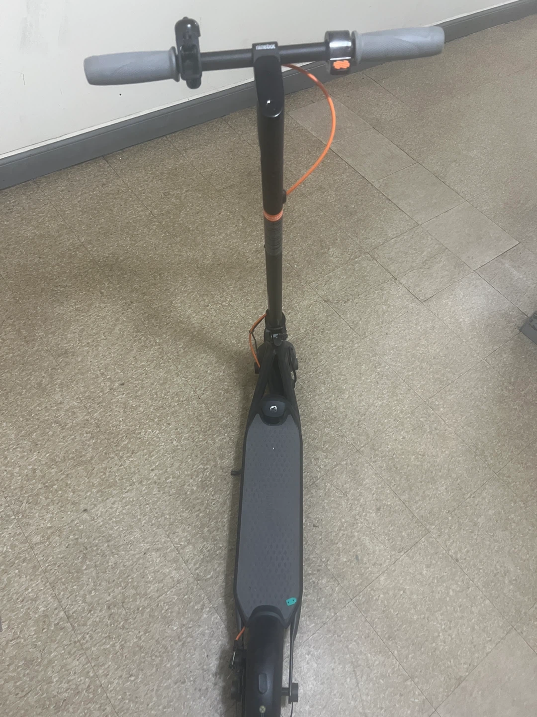 This is a Ninebot electric scooter. It's gray with orange accents. It features electronic and drum brakes with a max power of 500W. This scooter has a top speed of 15.5 mph and a max slope of 12%.