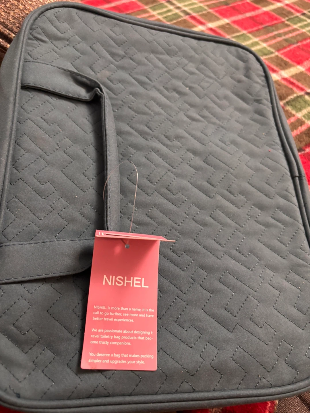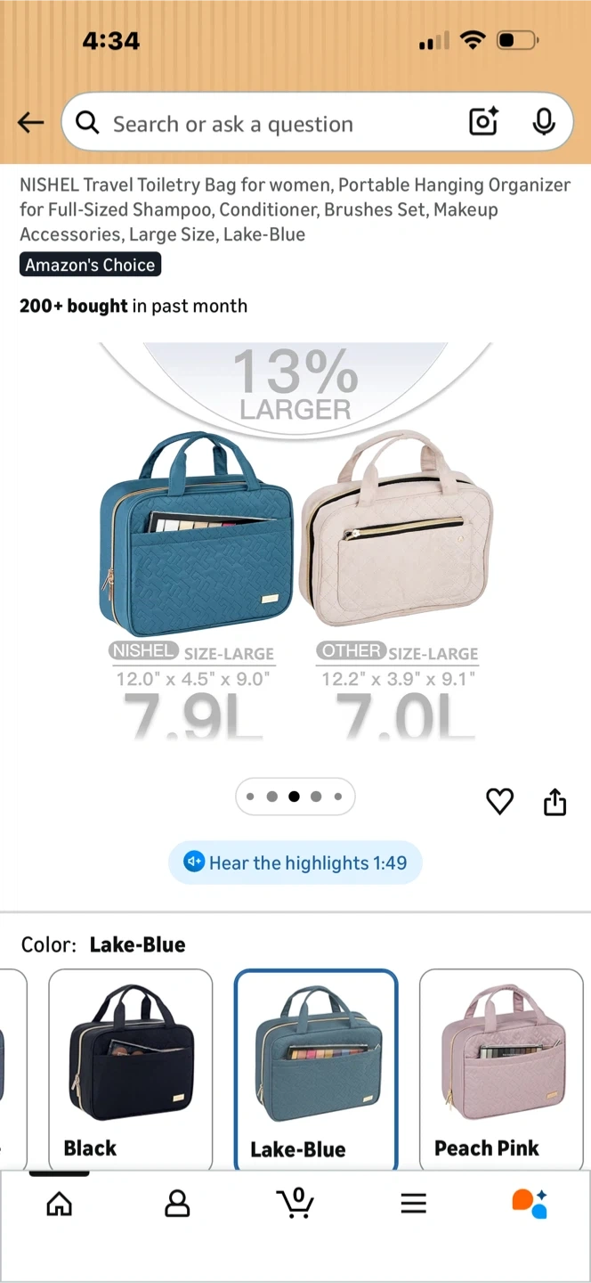 This NISHEL travel toiletry bag is a large-sized, hanging organizer in Lake-Blue. It's designed for women and includes compartments for full-sized shampoo, conditioner, brushes, and makeup accessories. The bag's dimensions are 12.0" x 4.5" x 9.0" with a 7.9L capacity.