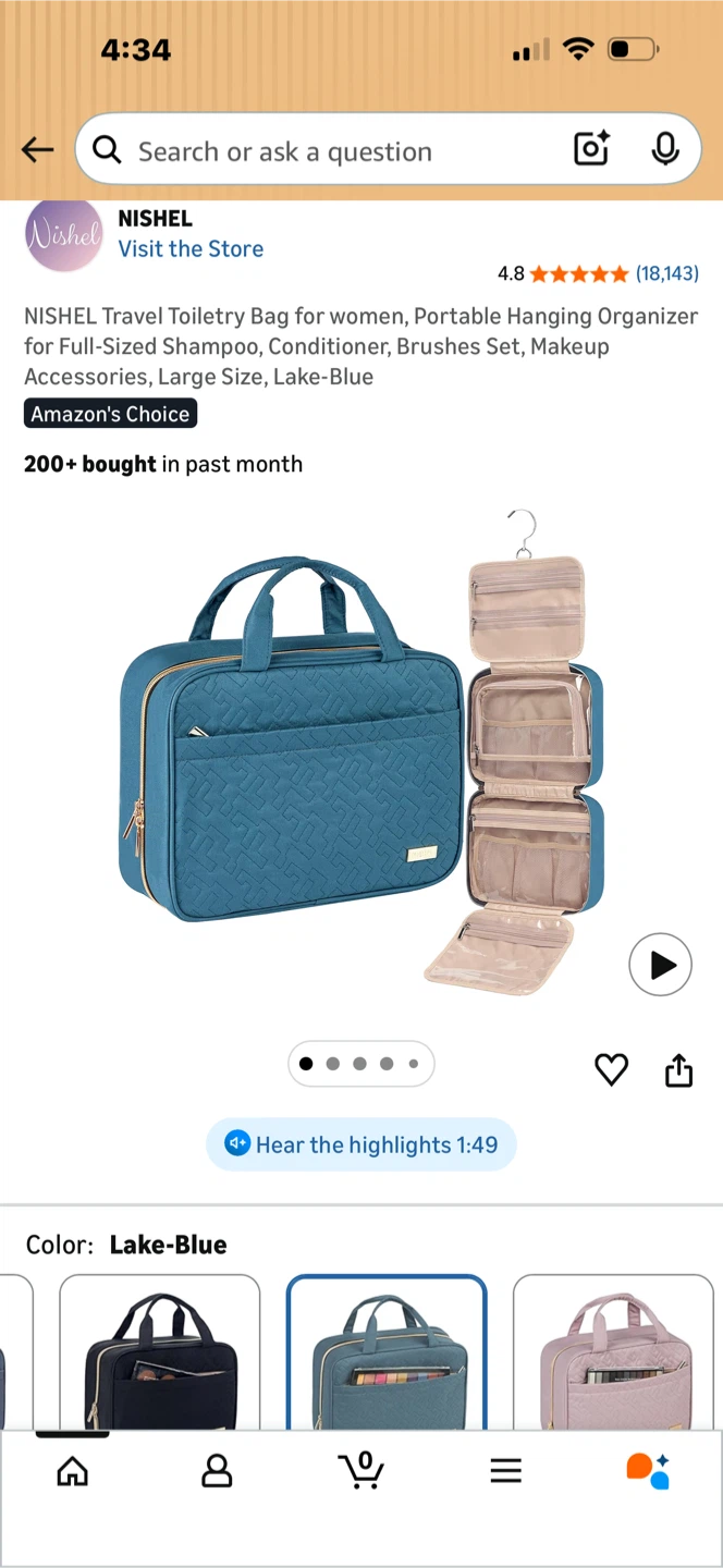 This NISHEL travel toiletry bag is a large-sized, hanging organizer in Lake-Blue. It's designed for women and includes compartments for full-sized shampoo, conditioner, brushes, and makeup accessories. The bag's dimensions are 12.0" x 4.5" x 9.0" with a 7.9L capacity.