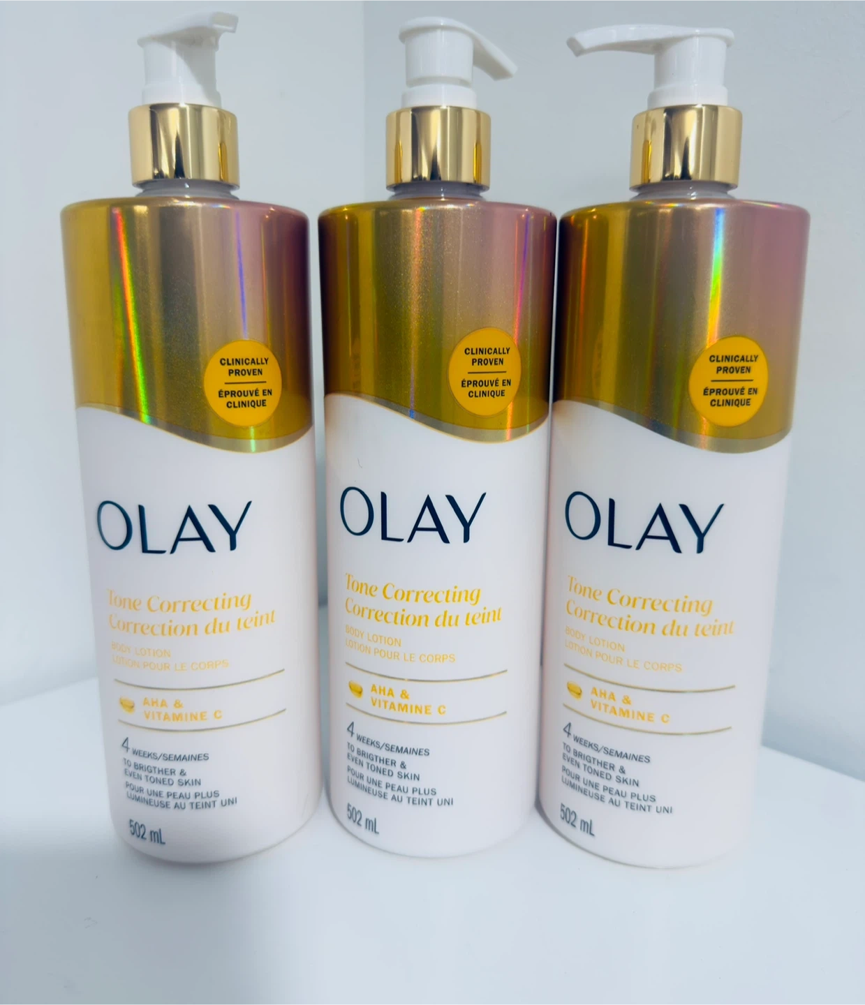 Olay Tone Correcting Body Lotion is clinically proven to brigther and even toned skin. This lotion contains AHA & Vitamin C. Each bottle is 502 mL. It's designed for use over 4 weeks.