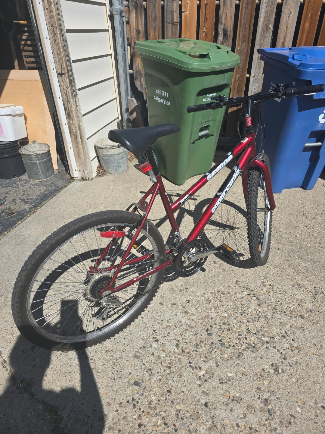 Red mountain bike. 26-inch wheels. Shimano components. Good condition.