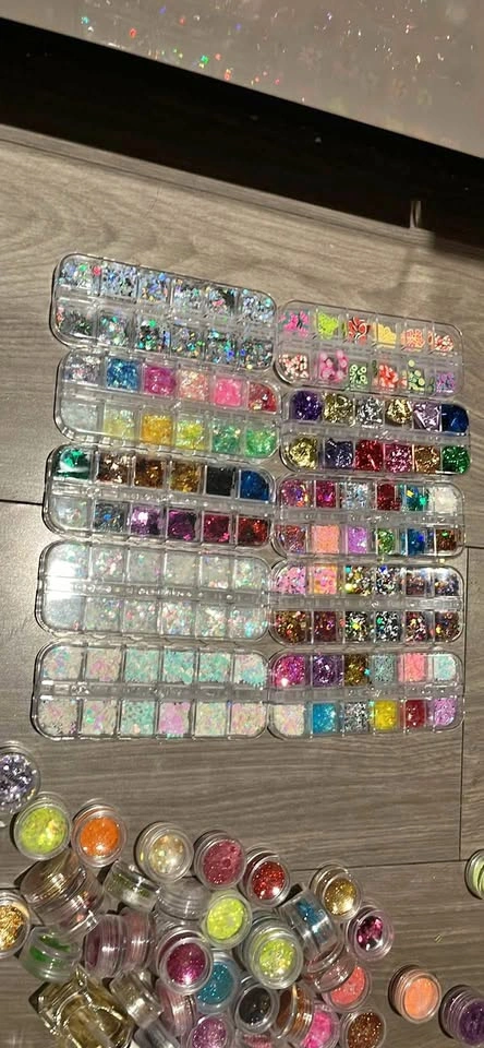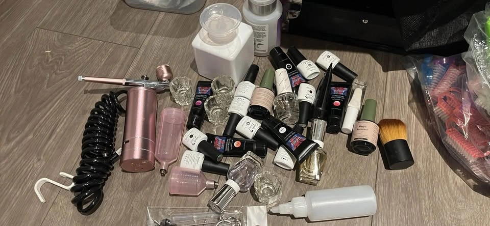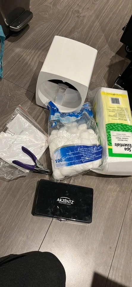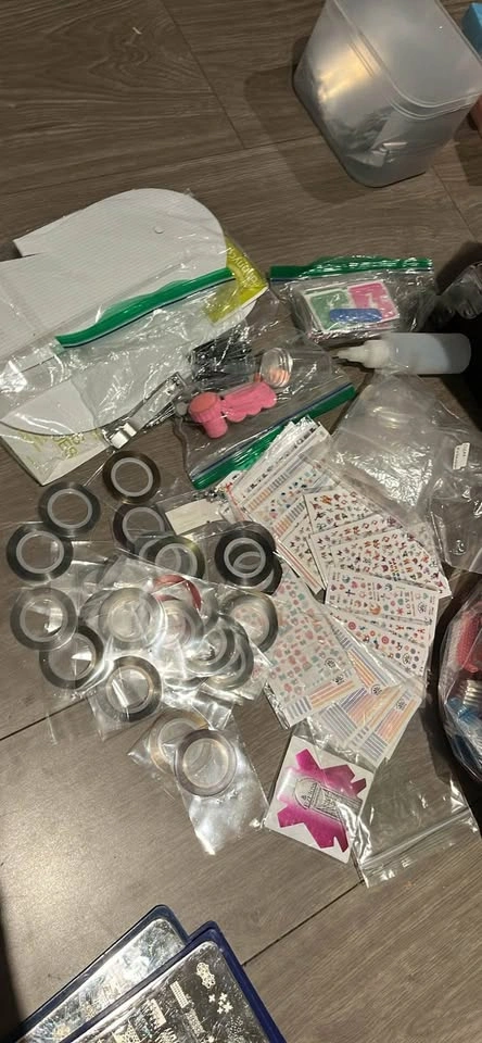 76Includes everything you pretty much need to start a nail business. Includes the following: LED lamp, gel polish, soft gel, nail extensions (both press on and half) , nail display tips, LARGE amount of sparkles/chrome. Premade nail extensions; just need glue. Foil for soft gel removal, entire box of brand new disposable buffer OVER 1000 pc, 1 gallon of acetone, cotton balls, cotton pads, nail fan, air brush (brand new) with cleaning supplies, nail stamp plates (with scraper and stamping tools) , Disposable flip flops. Disposable table cloth, gel brush wipes, nail forms, nail stickers, nail tape , small and large nail clippers , dabin dish, bottles for acetone/polish remover etc, cat eye magnets. I also will throw in a nail printer connects via Bluetooth/wifi. Has missing parts but easy to get replacement.