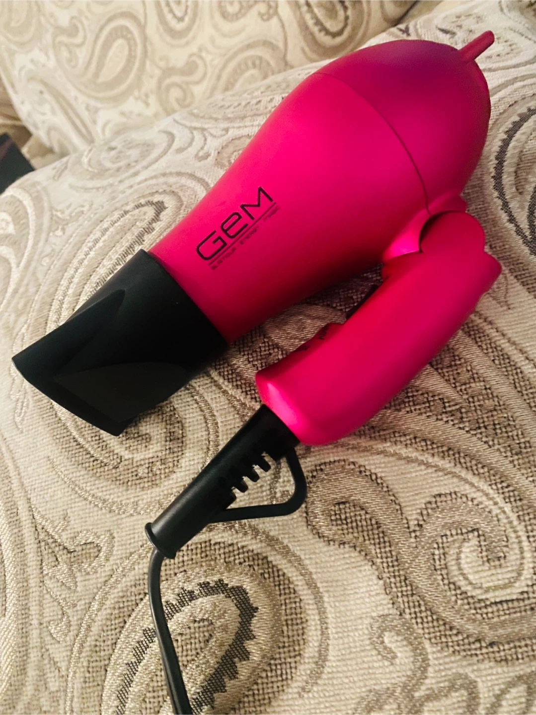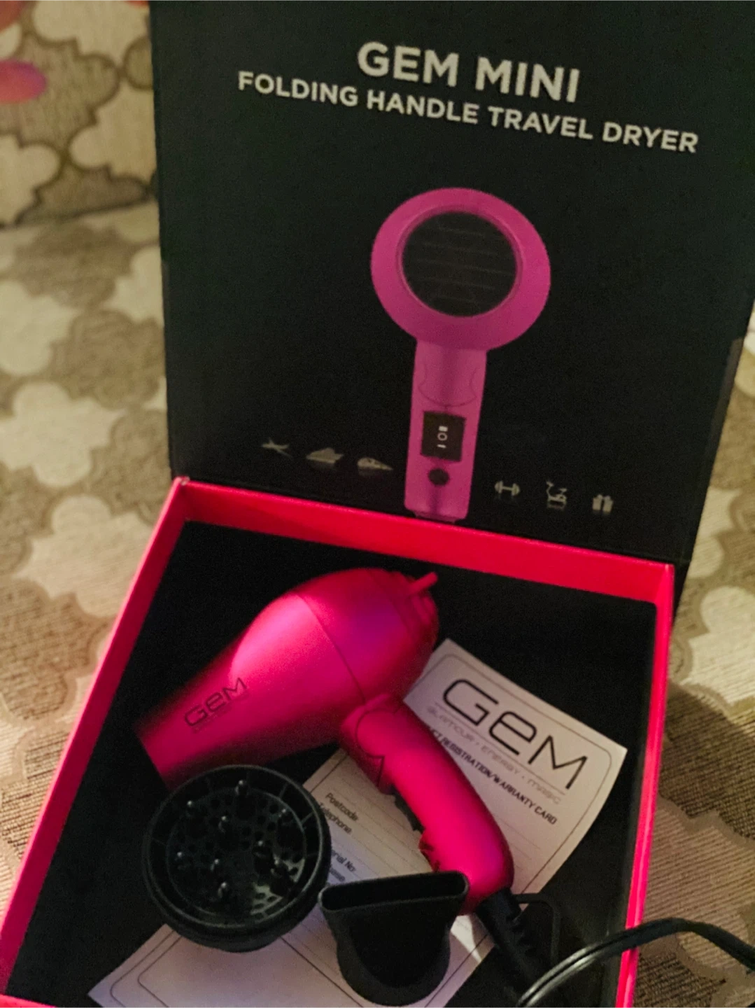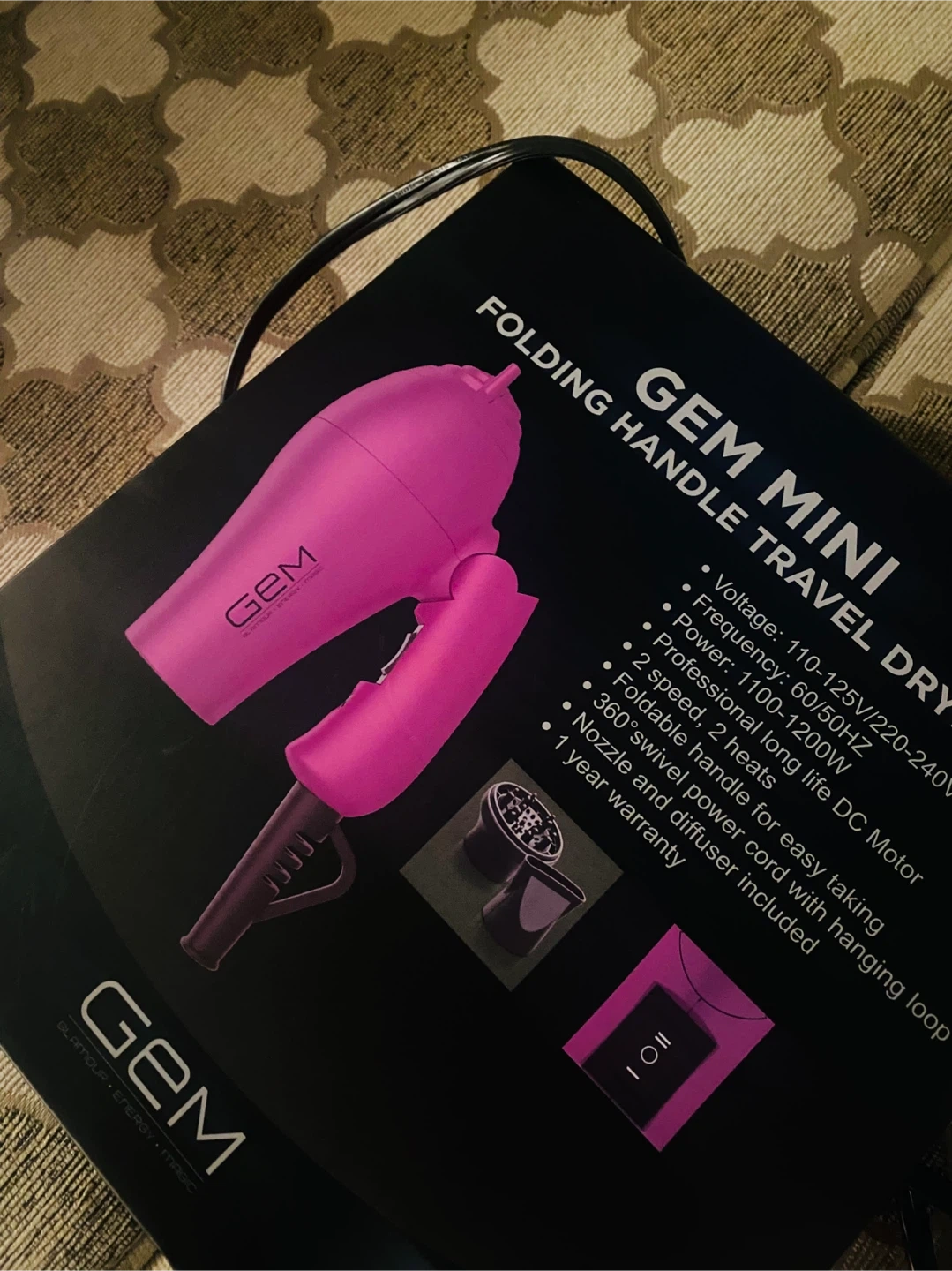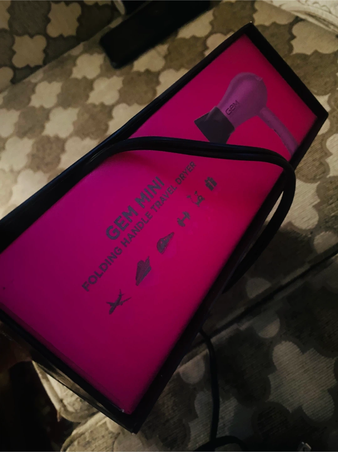 I am sell a GEM folding handle travel dryer in pink! It comes with the box and all original attachments. This dryer is perfect for travel due to its compact and foldable design. It's in great condition and ready for a new home! Pet free home. Cash only