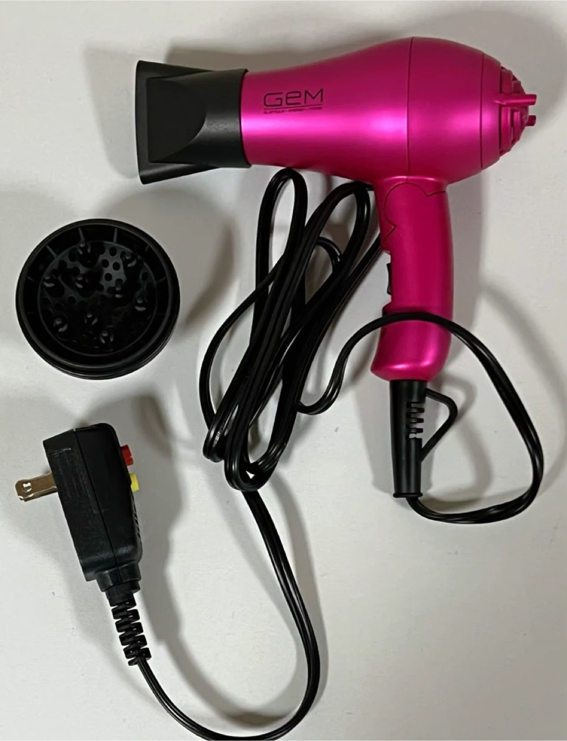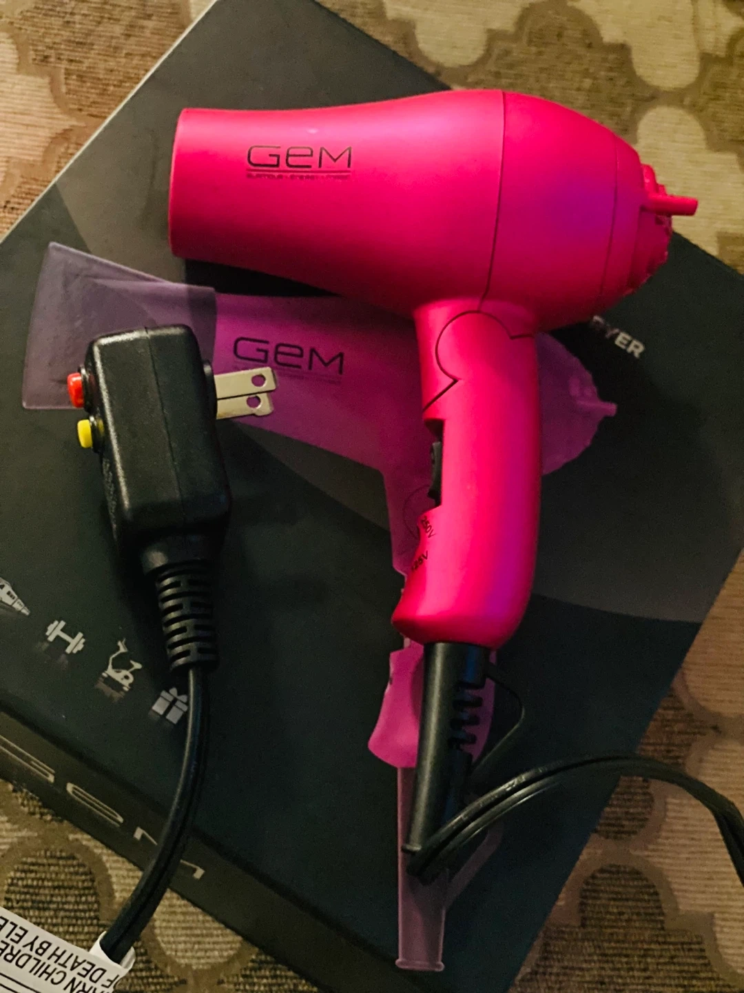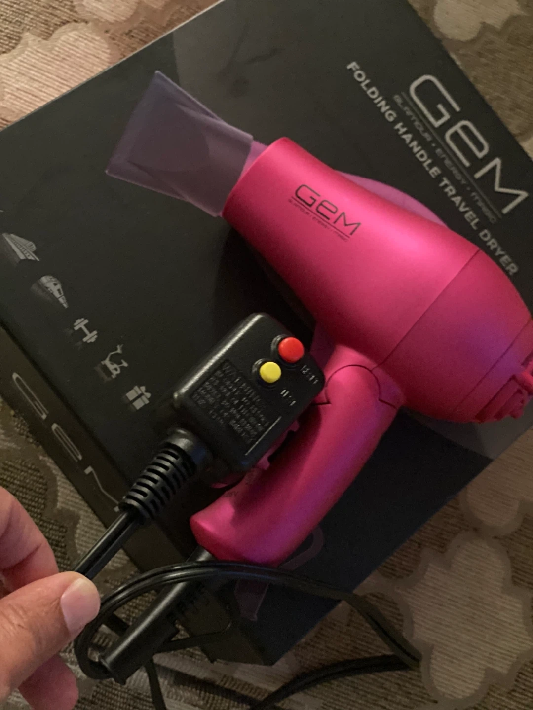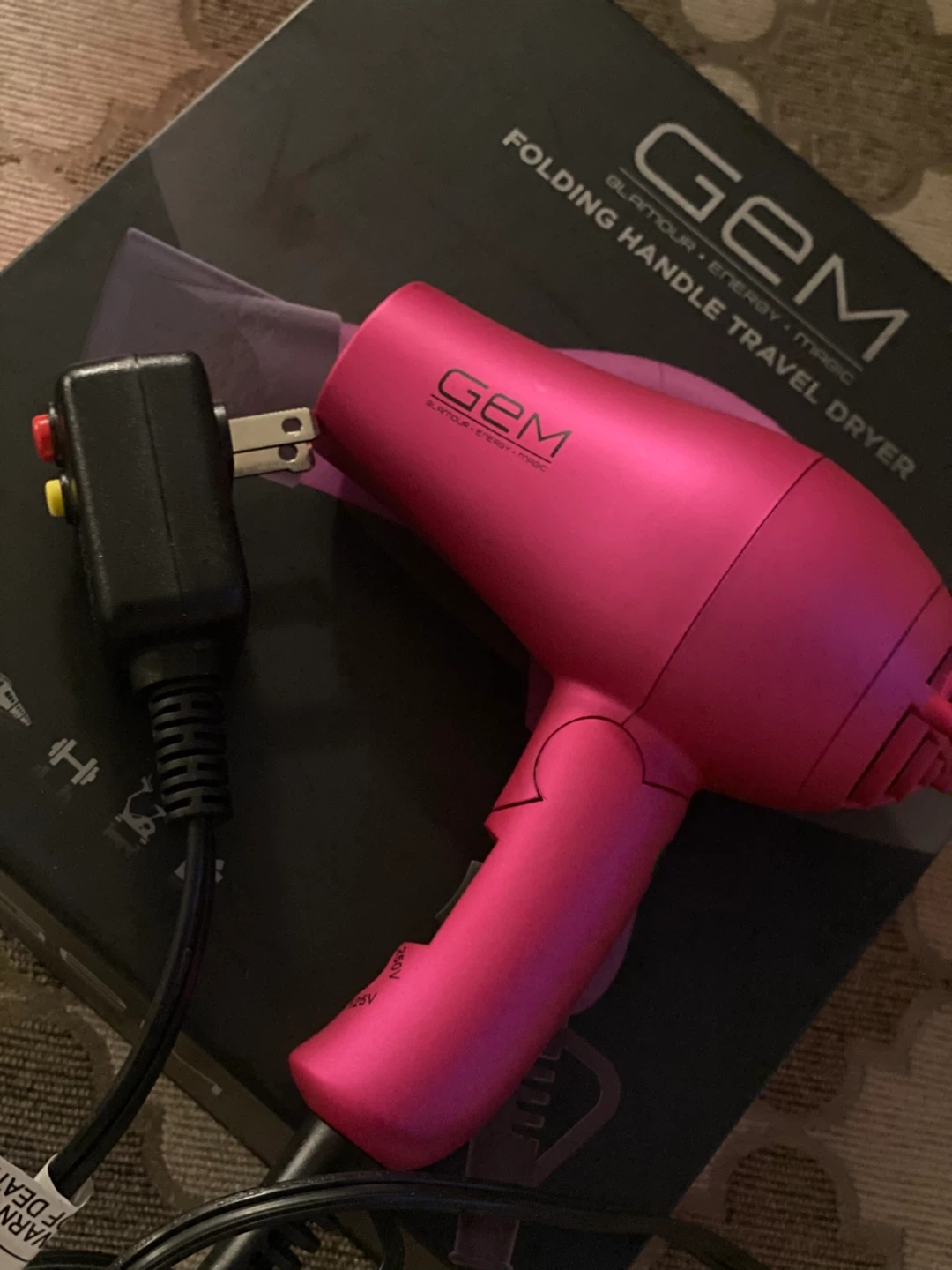 I am sell a GEM folding handle travel dryer in pink! It comes with the box and all original attachments. This dryer is perfect for travel due to its compact and foldable design. It's in great condition and ready for a new home! Pet free home. Cash only
