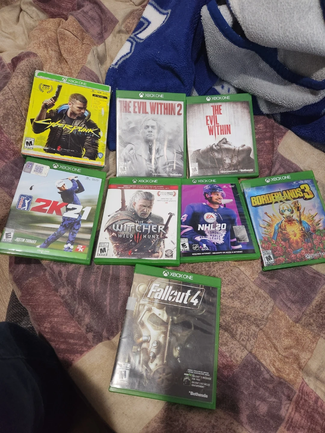 Bundle of 8 Xbox One video games $80 for all 8 or $15 each including Cyberpunk 2077, The Evil Within 2, The Evil Within, PGA Tour 2K21, The Witcher 3: Wild Hunt, and NHL 20. Fallout 4 , borderlands 3